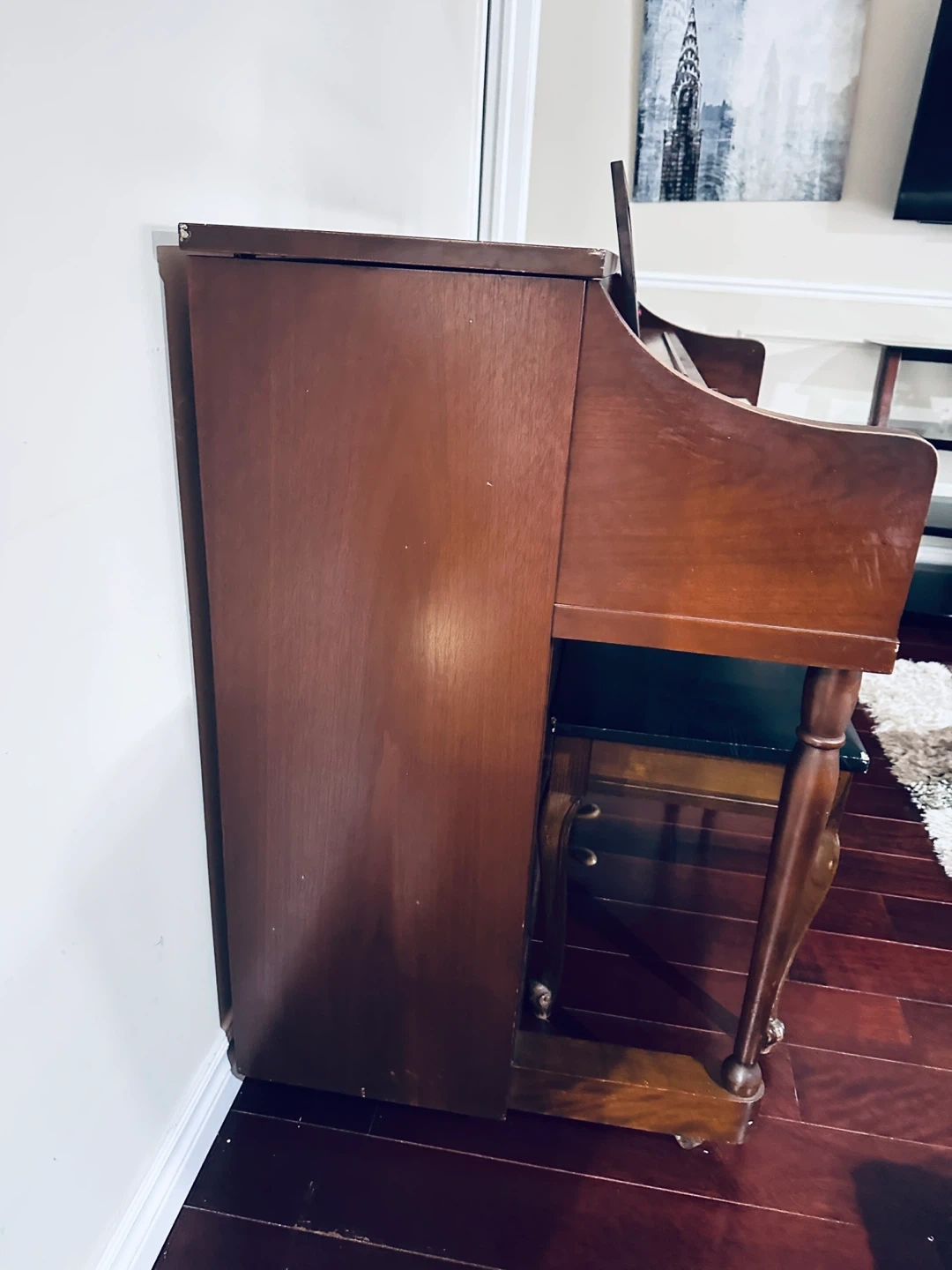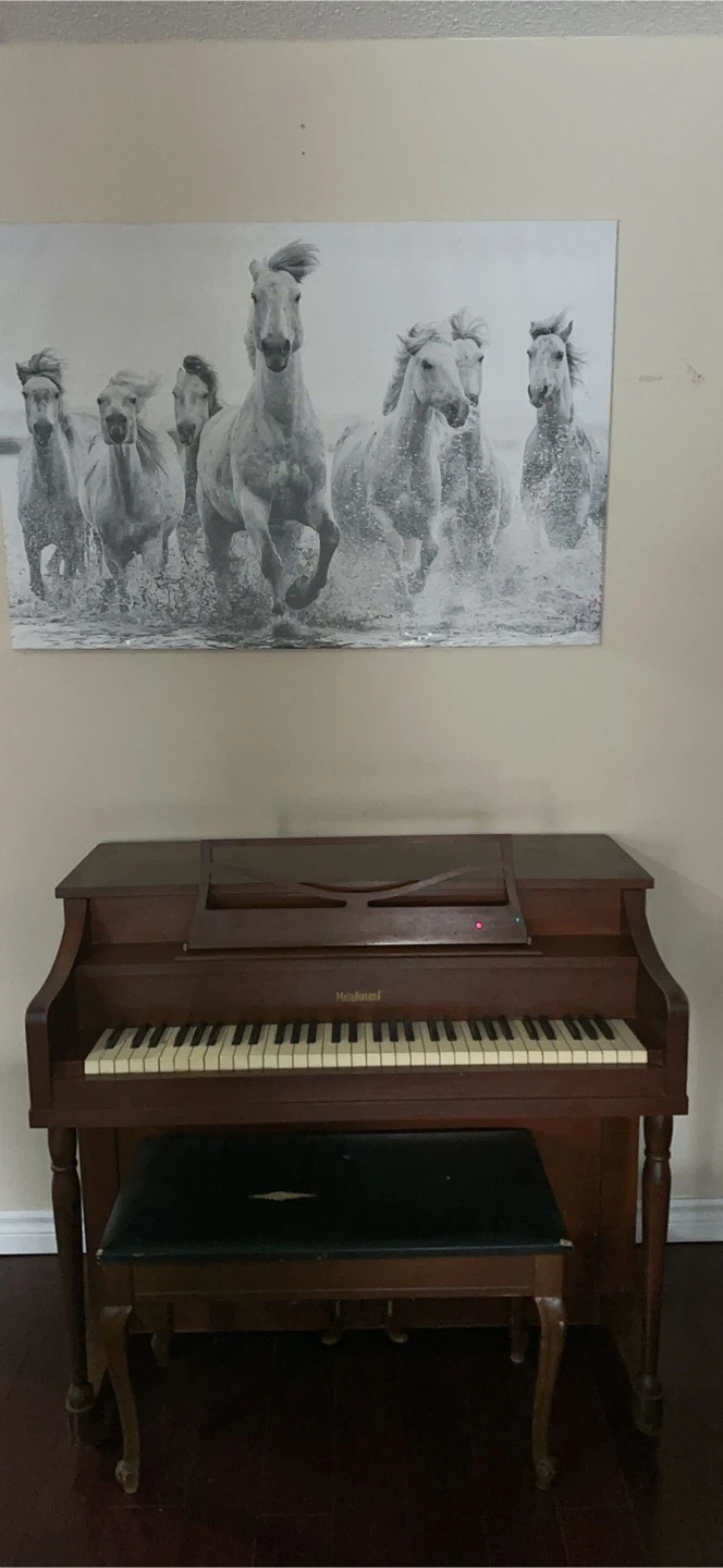This is a vintage Melodigrand upright piano. It's made of a dark wood finish and includes the original bench. This piano would be great for a beginner or someone looking for a classic instrument. Free give for a piano chair. Thanks