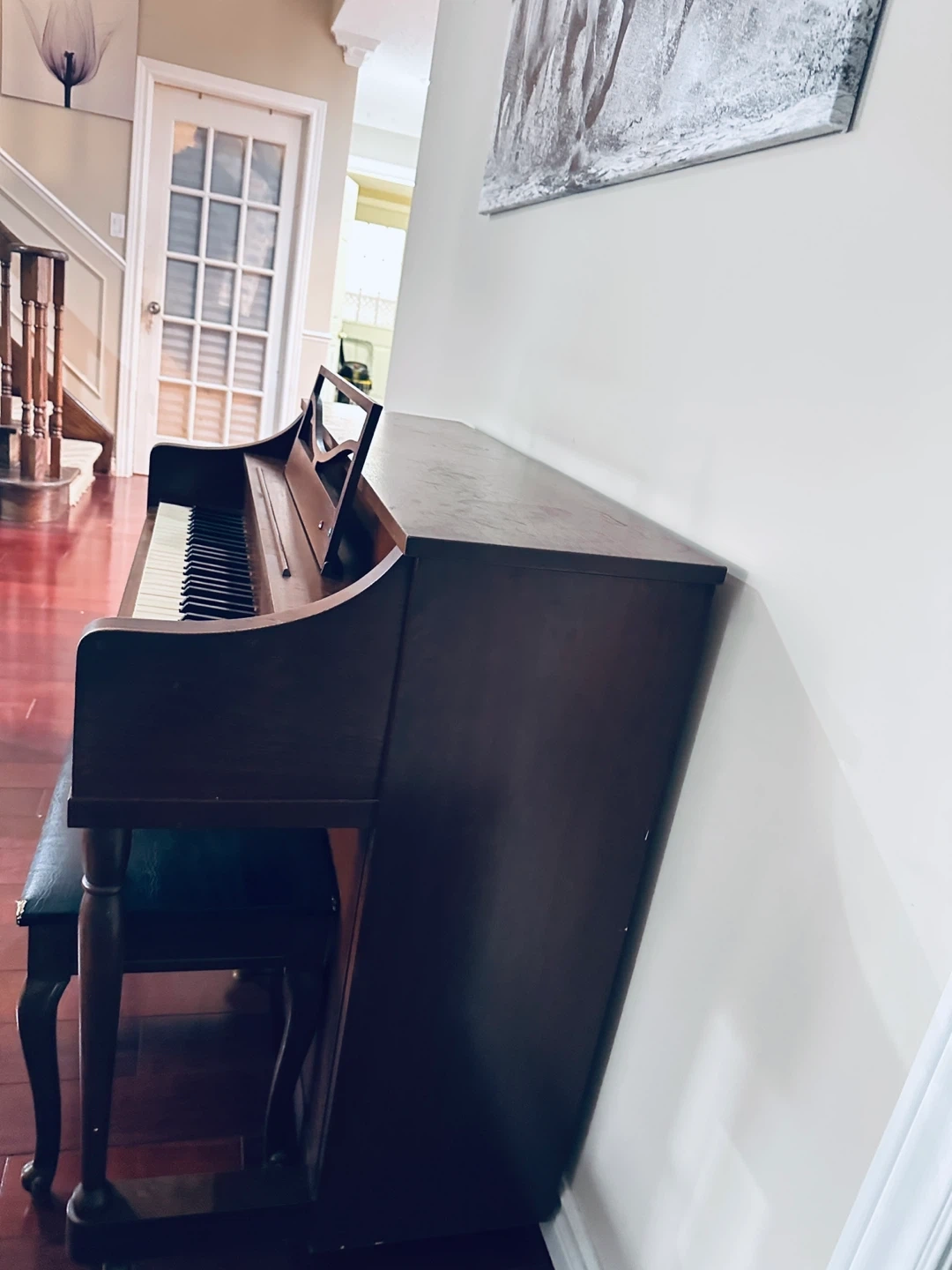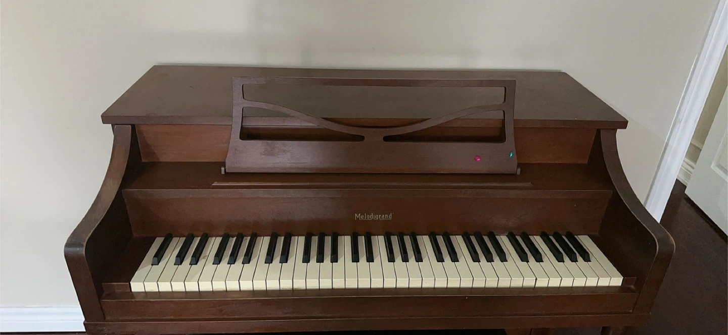 This is a vintage Melodigrand upright piano. It's made of a dark wood finish and includes the original bench. This piano would be great for a beginner or someone looking for a classic instrument. Free give for a piano chair. Thanks