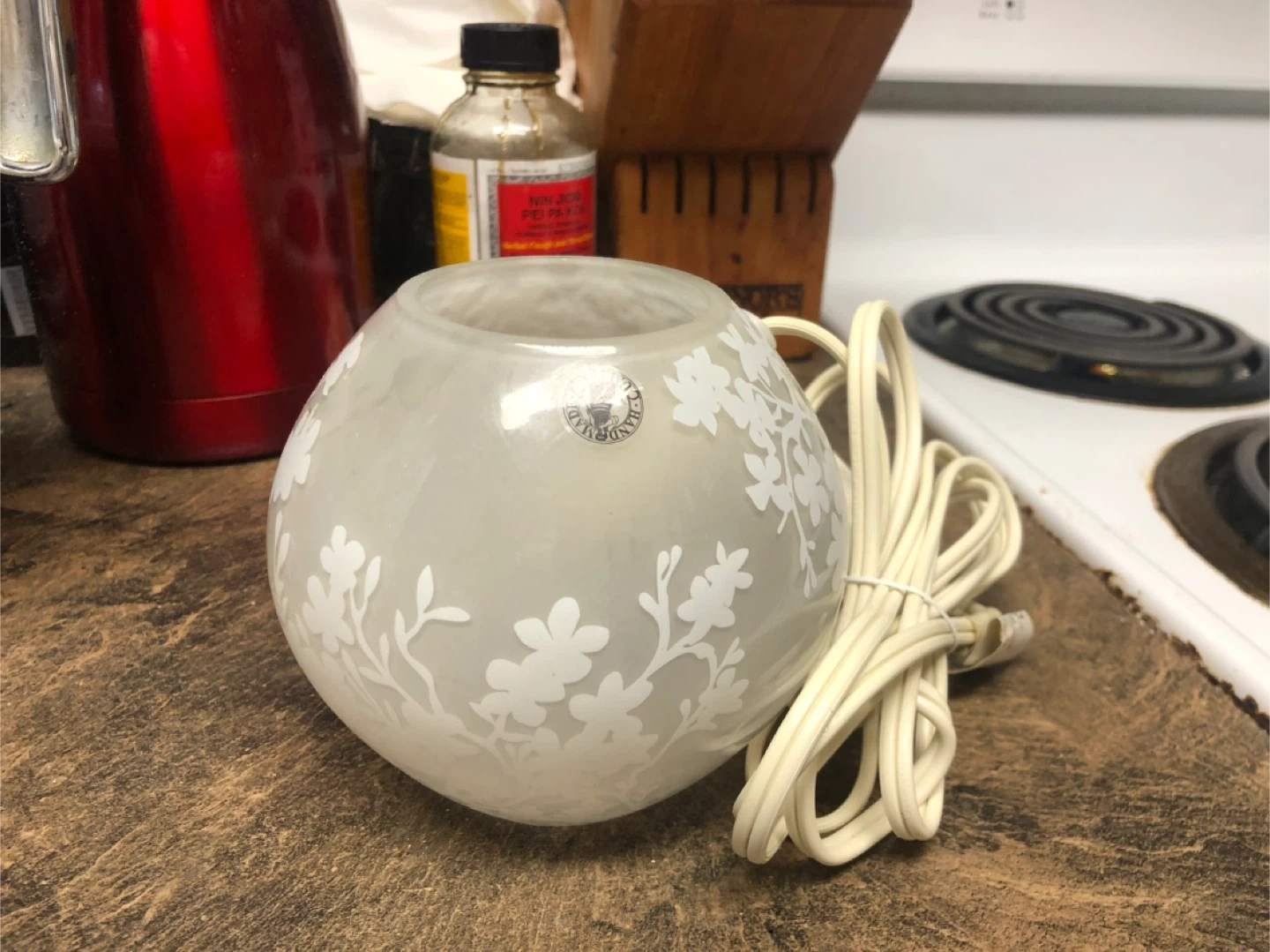 This frosted glass warmer features a delicate white floral design. It comes with a power cord for use , from ikea , need a new bulb from ikea a few dollars , light for sale $5.