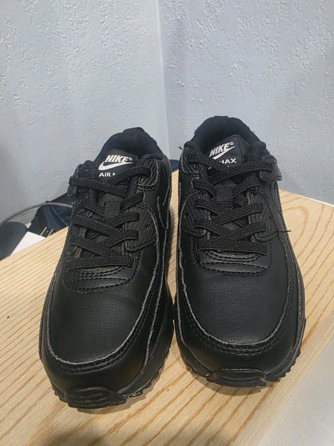 Black Nike Air Max 90 sneakers. Leather upper with Air Max cushioning. Lace-up closure for a secure fit.