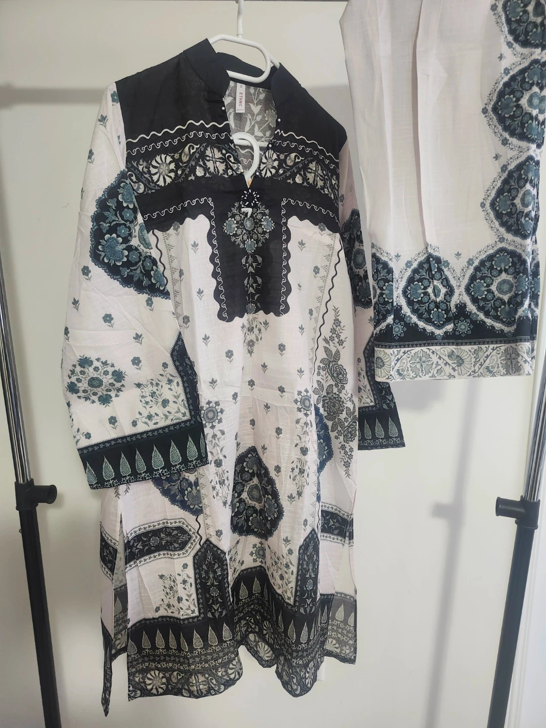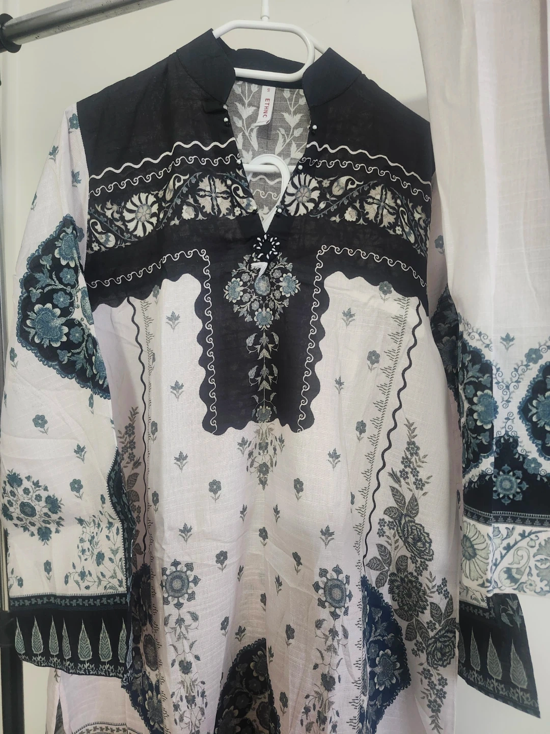 This is a lovely kurta and pants set with a detailed ethnic print. The fabric appears to be a light .suitable for warm weather. It's a two-piece outfit perfect for casual or semi-formal occasions.brand ethnic.