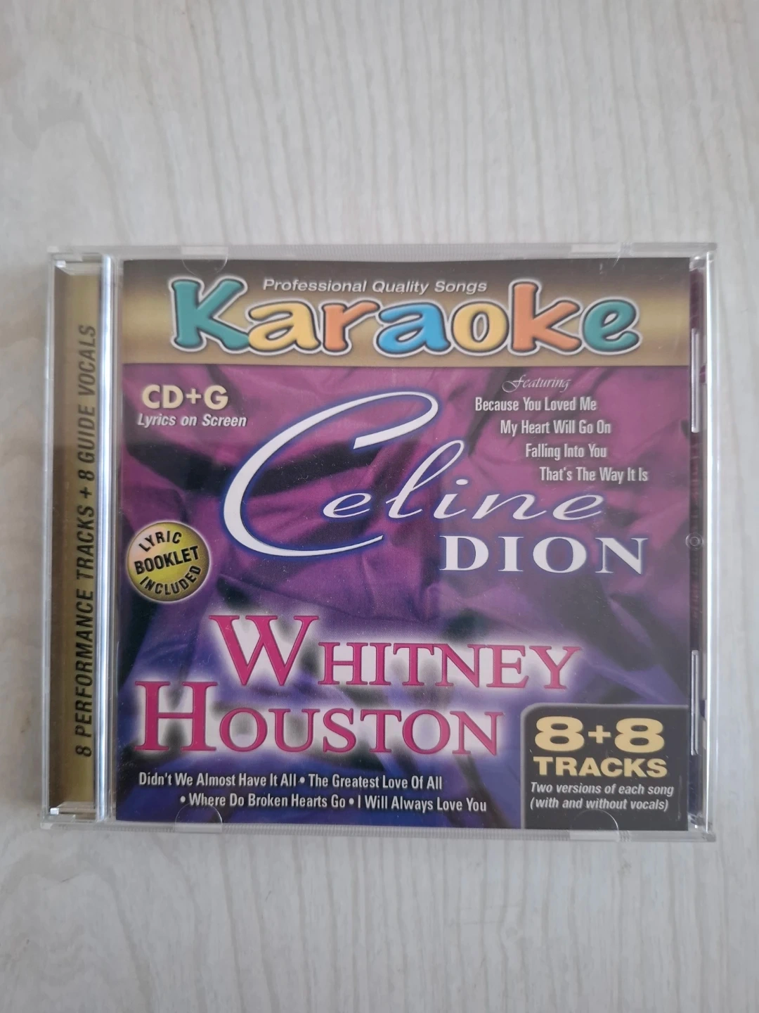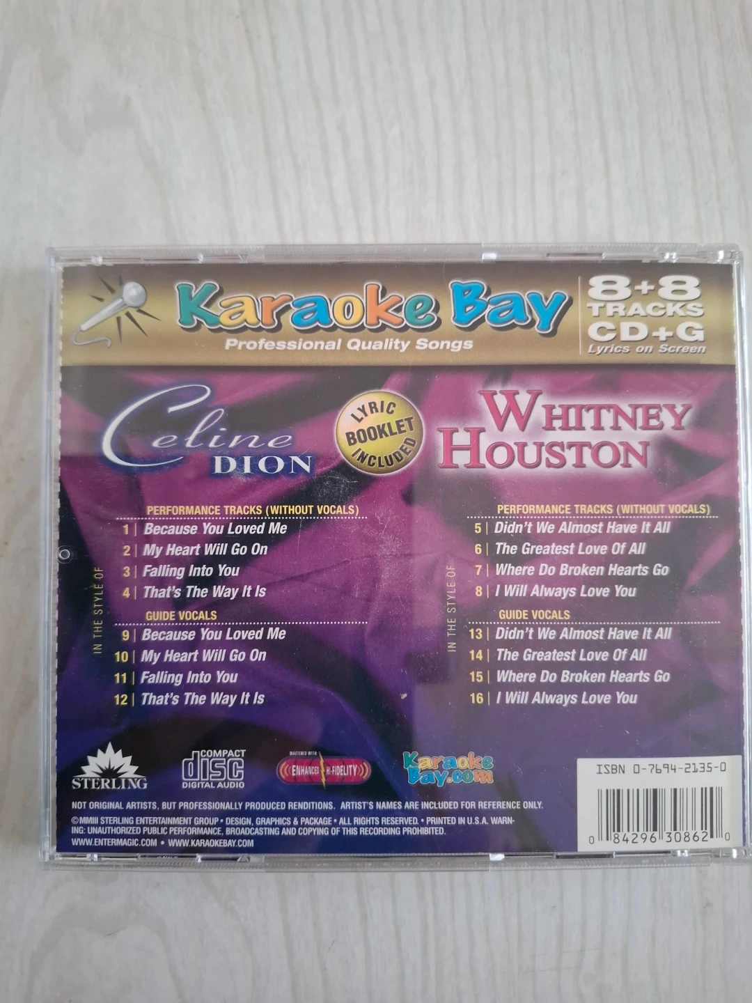 Karaoke Bay CD+G disc featuring songs by Celine Dion and Whitney Houston. Includes 8 performance tracks and 8 guide vocal tracks. Lyric booklet is included. This disc is in the style of professional quality songs.