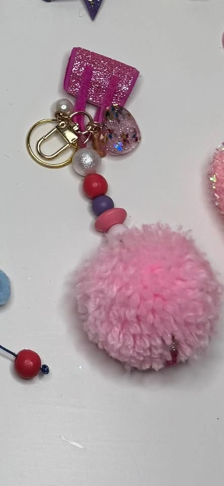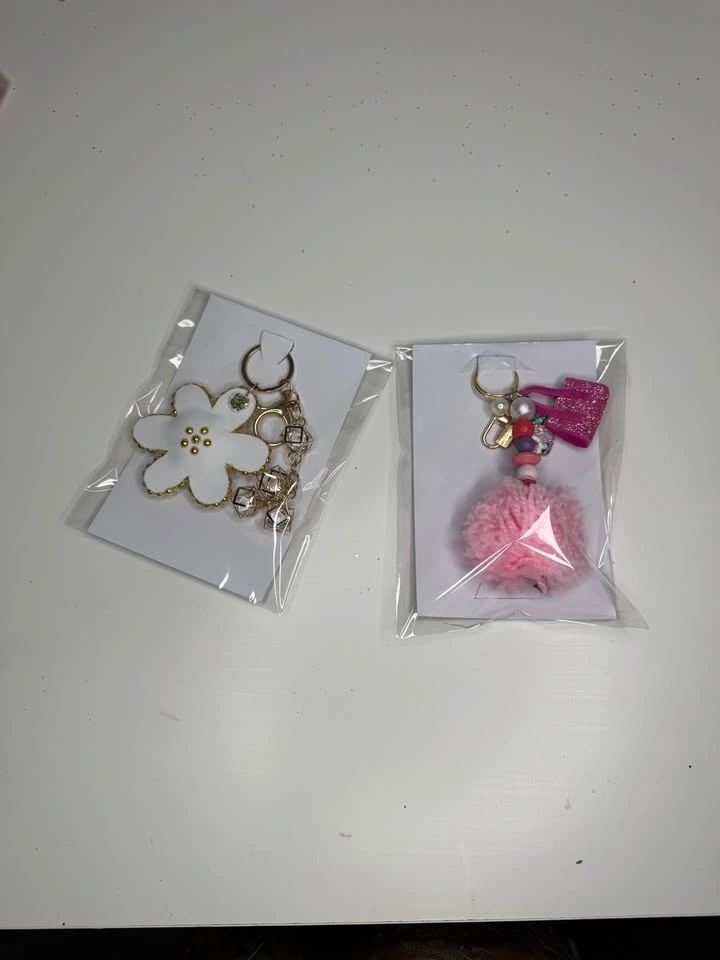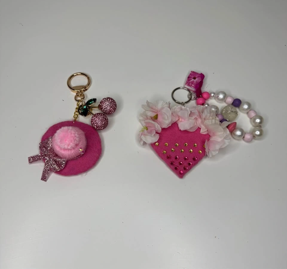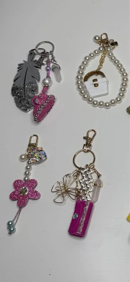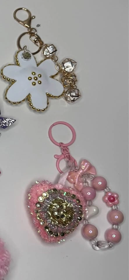 Sparkly keychains with lots of different designs. Heart shapes, bows, little bags, flowers, rainbows. Some with glitter, beads, pearls, and tassels. Super fun for your keys or bag.