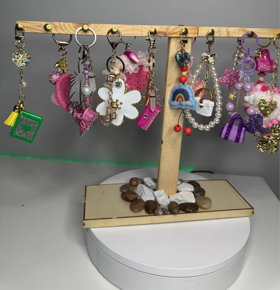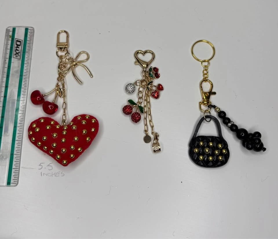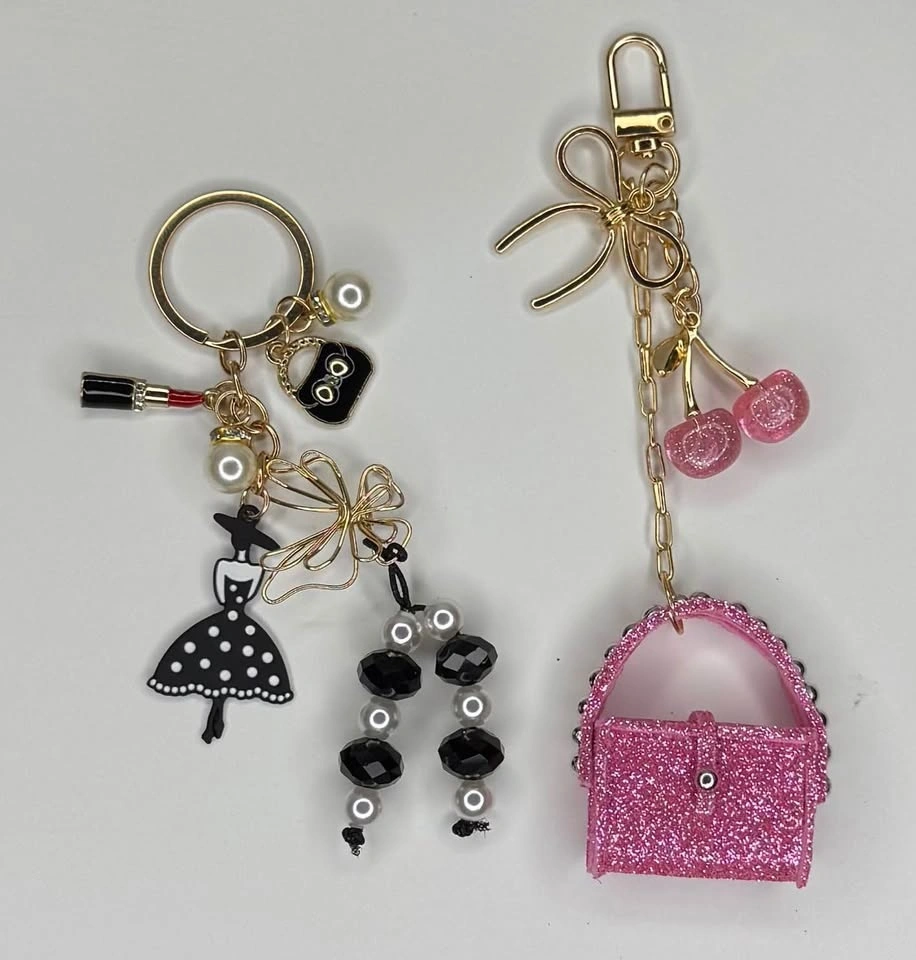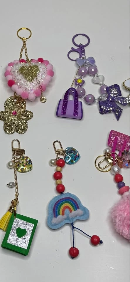 Sparkly keychains with lots of different designs. Heart shapes, bows, little bags, flowers, rainbows. Some with glitter, beads, pearls, and tassels. Super fun for your keys or bag.