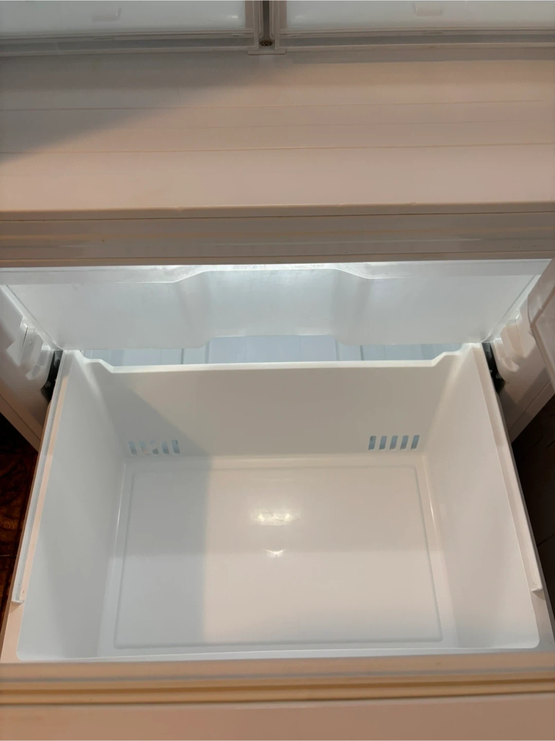 This is a clean, empty fridge freezer. It has glass shelves and clear crisper drawers. The door has multiple compartments. Ready for your groceries!