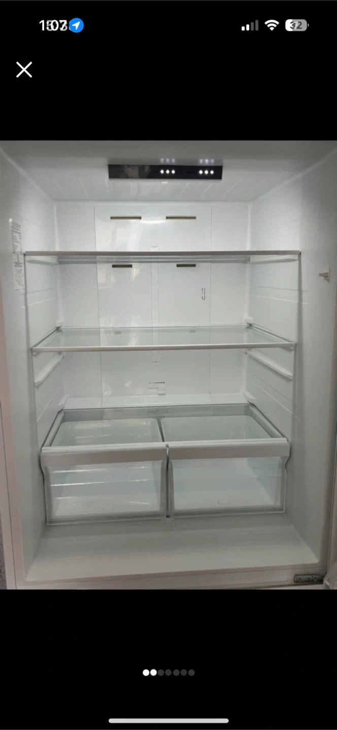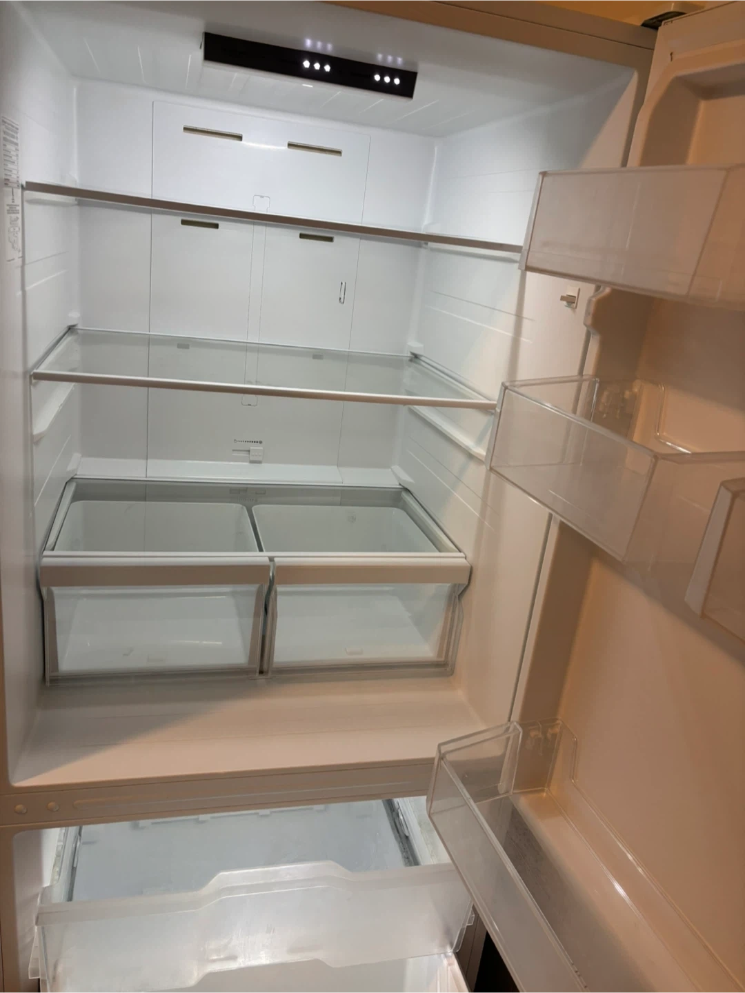 This is a clean, empty fridge freezer. It has glass shelves and clear crisper drawers. The door has multiple compartments. Ready for your groceries!