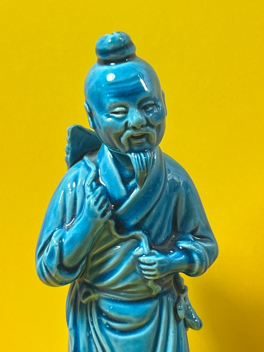 This is a striking blue ceramic figurine of an elderly man with a beard. It's glazed with a vibrant turquoise finish. The piece has a weight and solid feel to it. It's a decorative item that'll add character to any shelf!