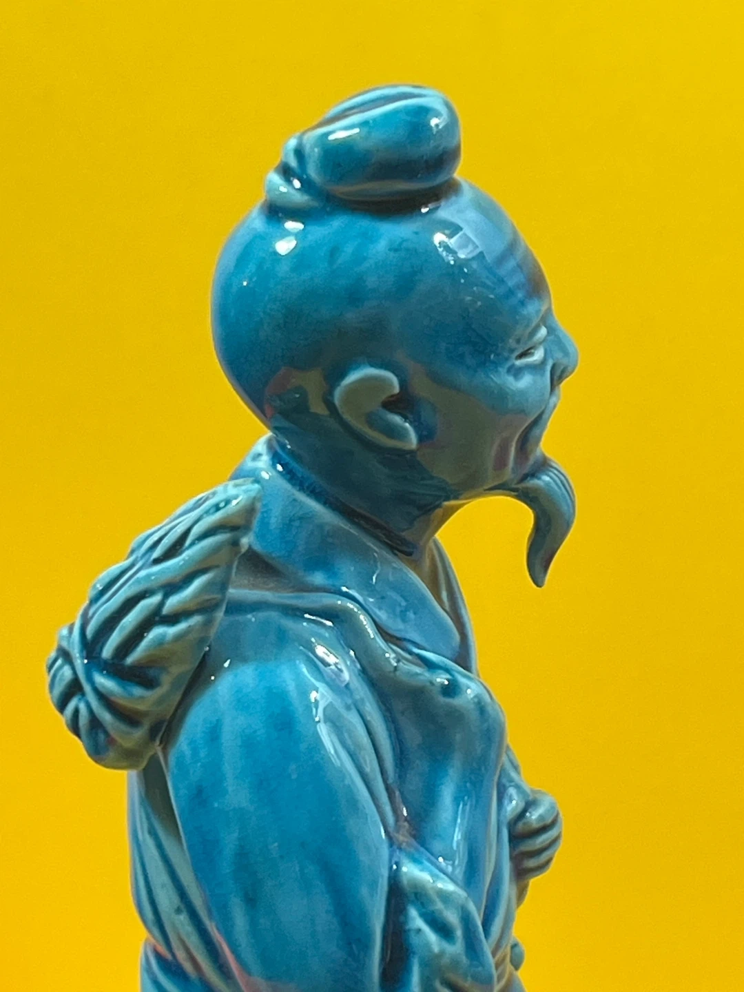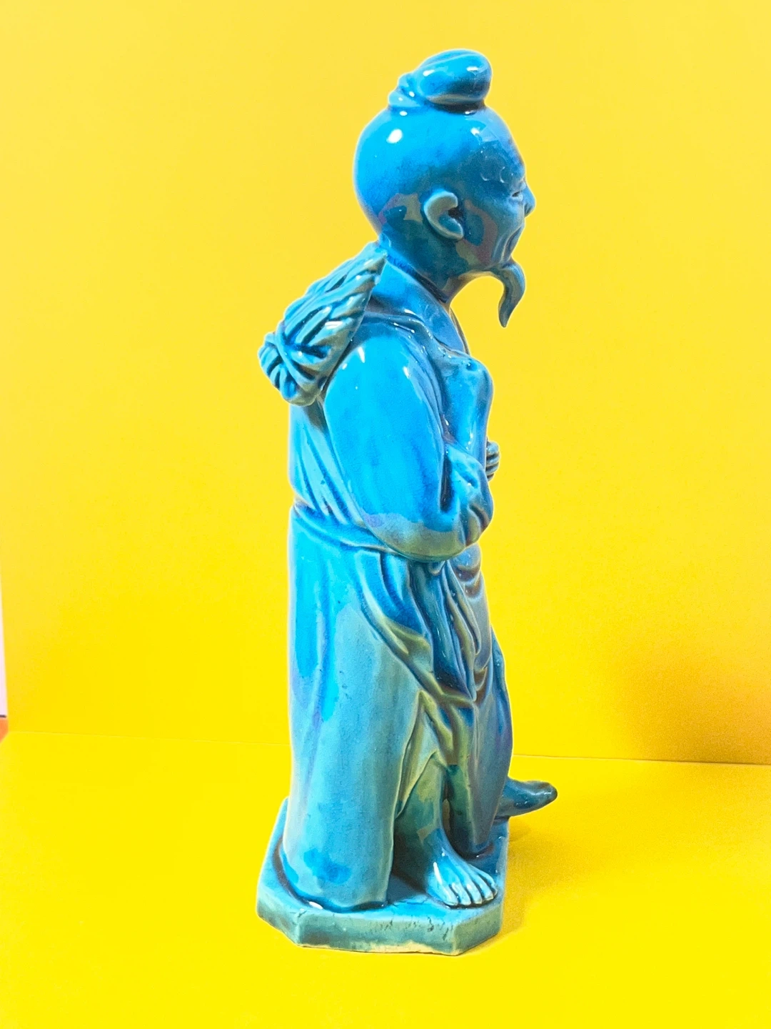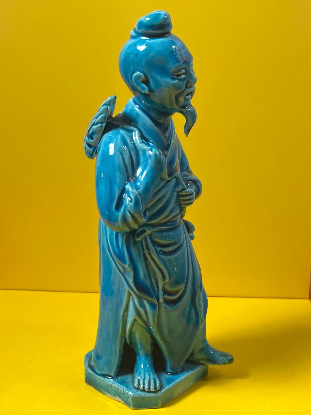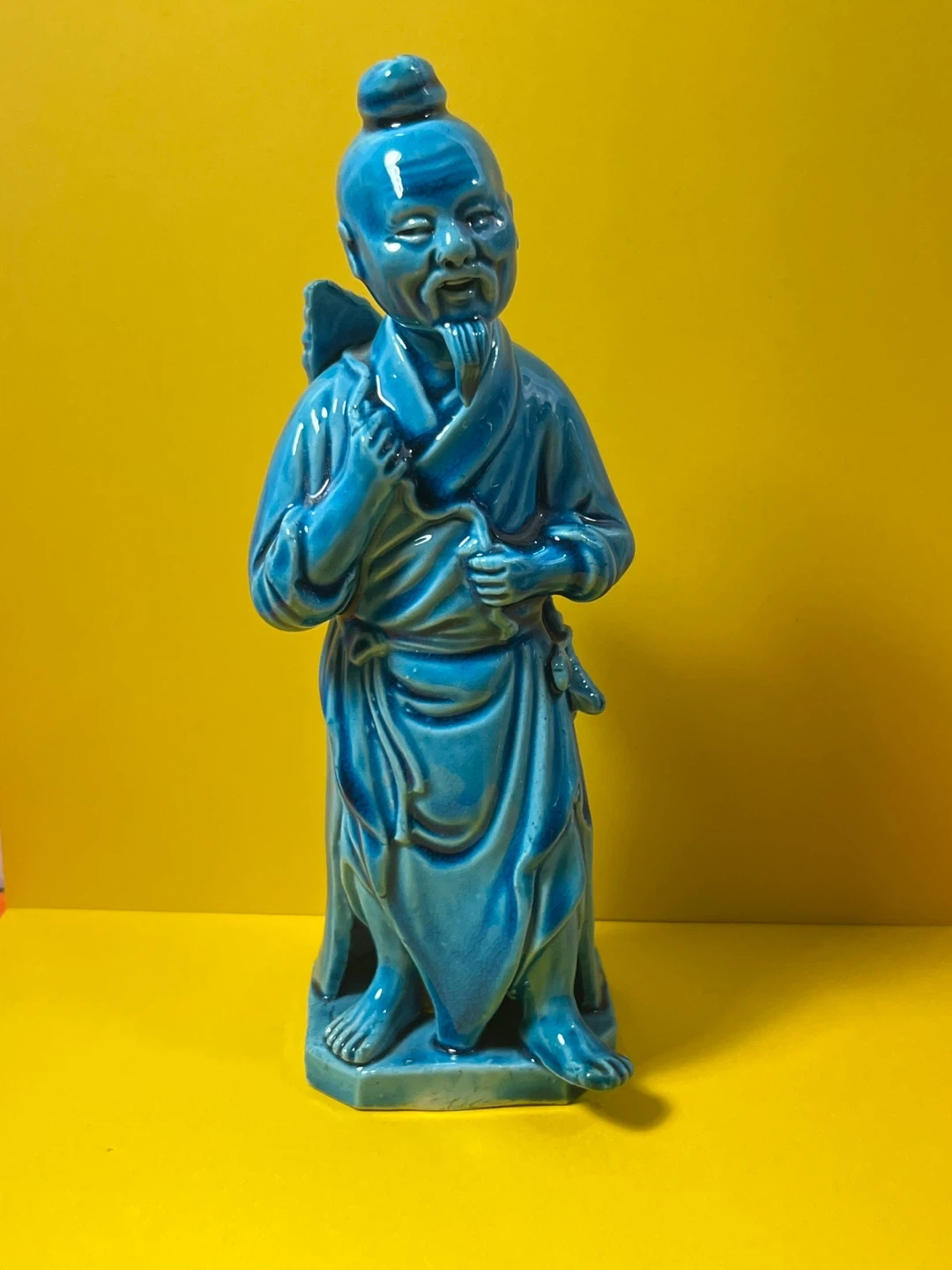 This is a striking blue ceramic figurine of an elderly man with a beard. It's glazed with a vibrant turquoise finish. The piece has a weight and solid feel to it. It's a decorative item that'll add character to any shelf!