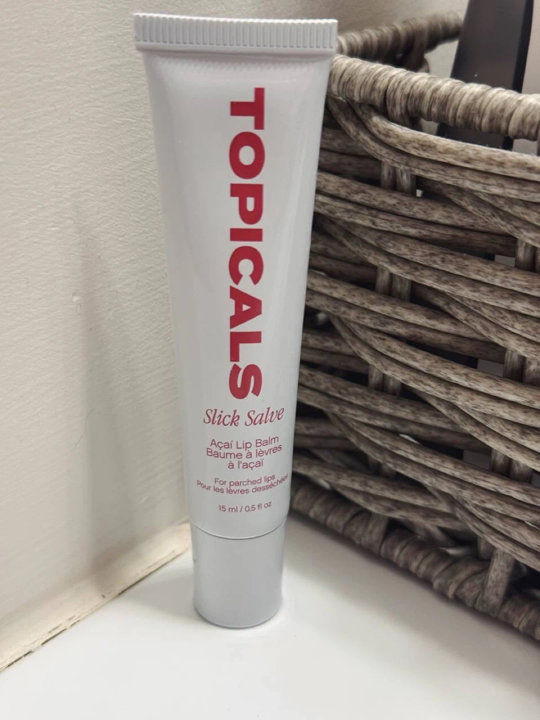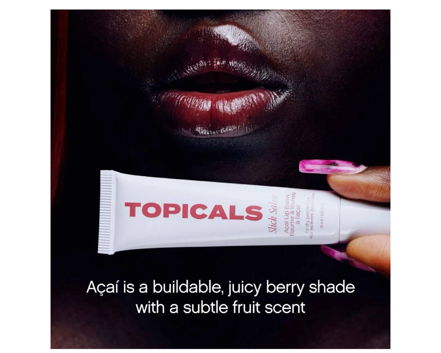 Hydrating TOPICALS Slick Salve Glossy Lip Balm. This is the Acai flavor, perfect for dry, parched lips. It relieves severe dryness and strengthens your moisture barrier. Has long-lasting hydration and soothes discomfort. 100% Vegan + Cruelty free. Contains good stuff like Rice Bran Wax, Hyaluronic Acid, Ceramides, and Glycerin. Comes in a 15 ml / 0.5 fl oz tube.