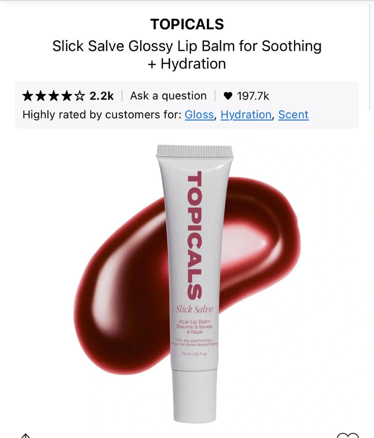 Hydrating TOPICALS Slick Salve Glossy Lip Balm. This is the Acai flavor, perfect for dry, parched lips. It relieves severe dryness and strengthens your moisture barrier. Has long-lasting hydration and soothes discomfort. 100% Vegan + Cruelty free. Contains good stuff like Rice Bran Wax, Hyaluronic Acid, Ceramides, and Glycerin. Comes in a 15 ml / 0.5 fl oz tube.