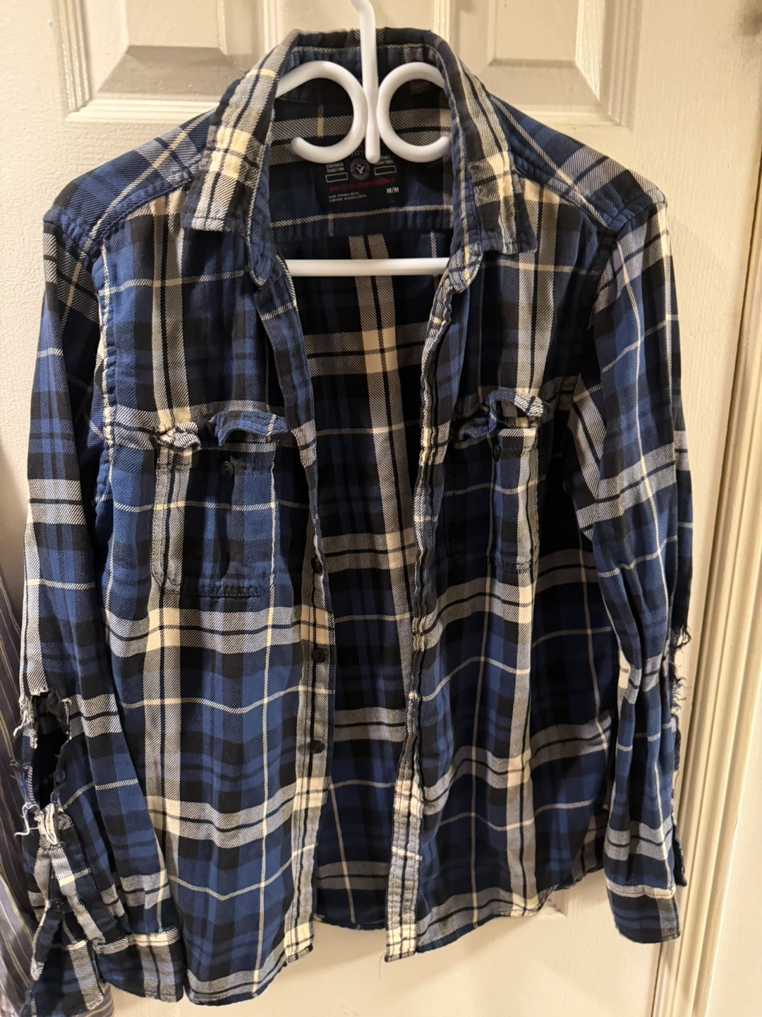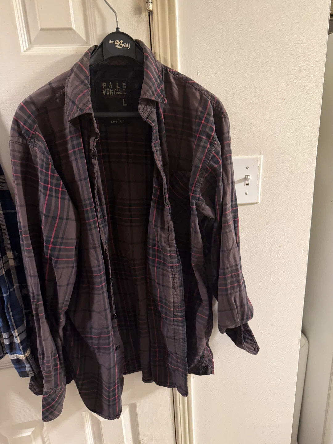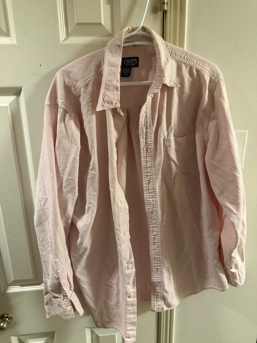 Bundle includes a pink Chaps button-up shirt, a blue plaid shirt, a grey and red plaid shirt, and a blue and yellow striped shirt. Various brands and sizes are present in the bundle.