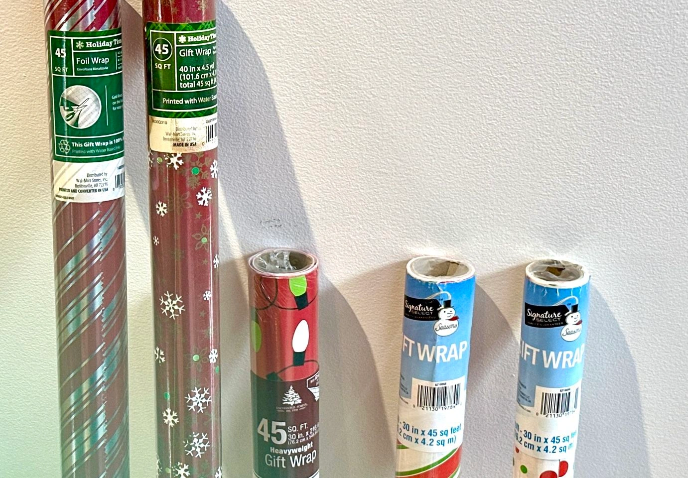 5 Holiday Christmas Wrapping Paper Rolls. 45 Sq. Ft. Each for a total of 225 Sq. Ft. Variety of Holiday Patterns. All 5 Rolls are new in individual packaging.
