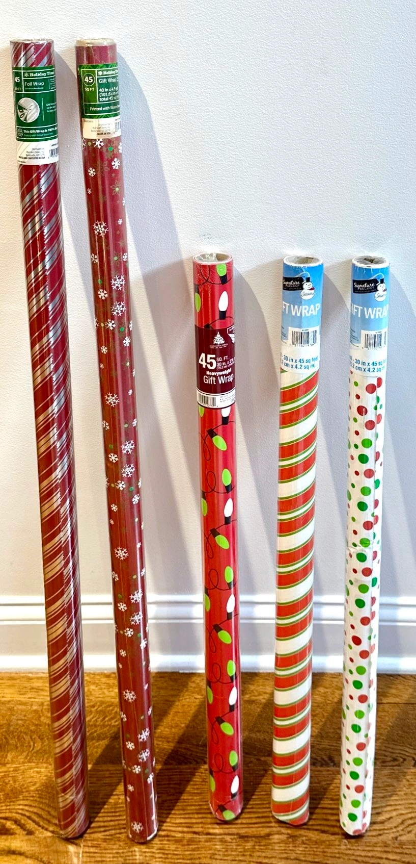 5 Holiday Christmas Wrapping Paper Rolls. 45 Sq. Ft. Each for a total of 225 Sq. Ft. Variety of Holiday Patterns. All 5 Rolls are new in individual packaging.