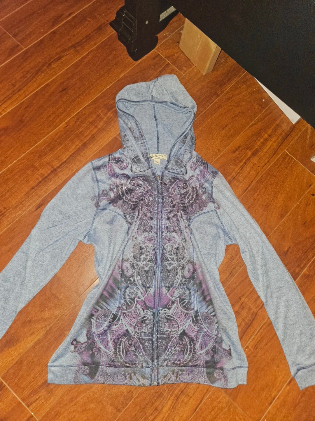 This Unity World Wear zip-up hoodie features a striking graphic design on the front. It's a size medium and made with a comfortable blend of materials. The full zip closure makes it easy to wear.