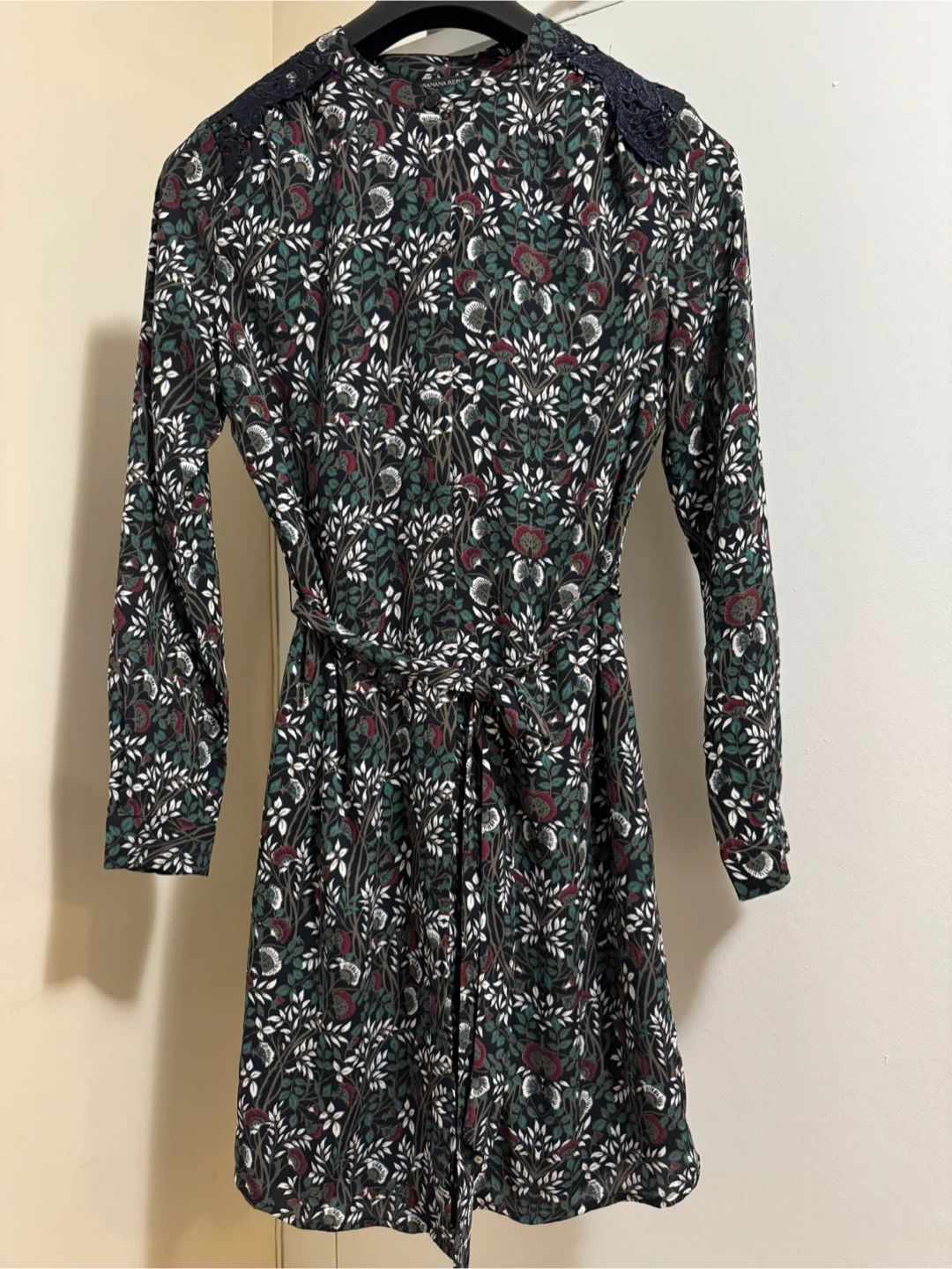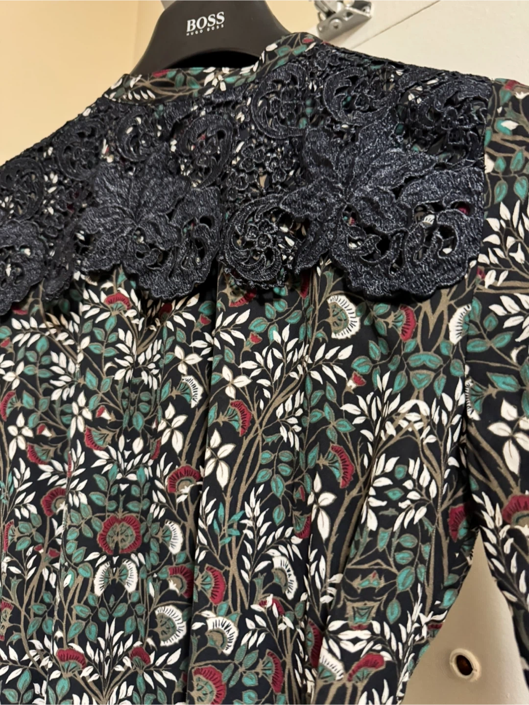 Here's a beautiful Banana Republic dress in size 4! It features a lovely floral pattern and a stylish lace collar. Perfect for any occasion!