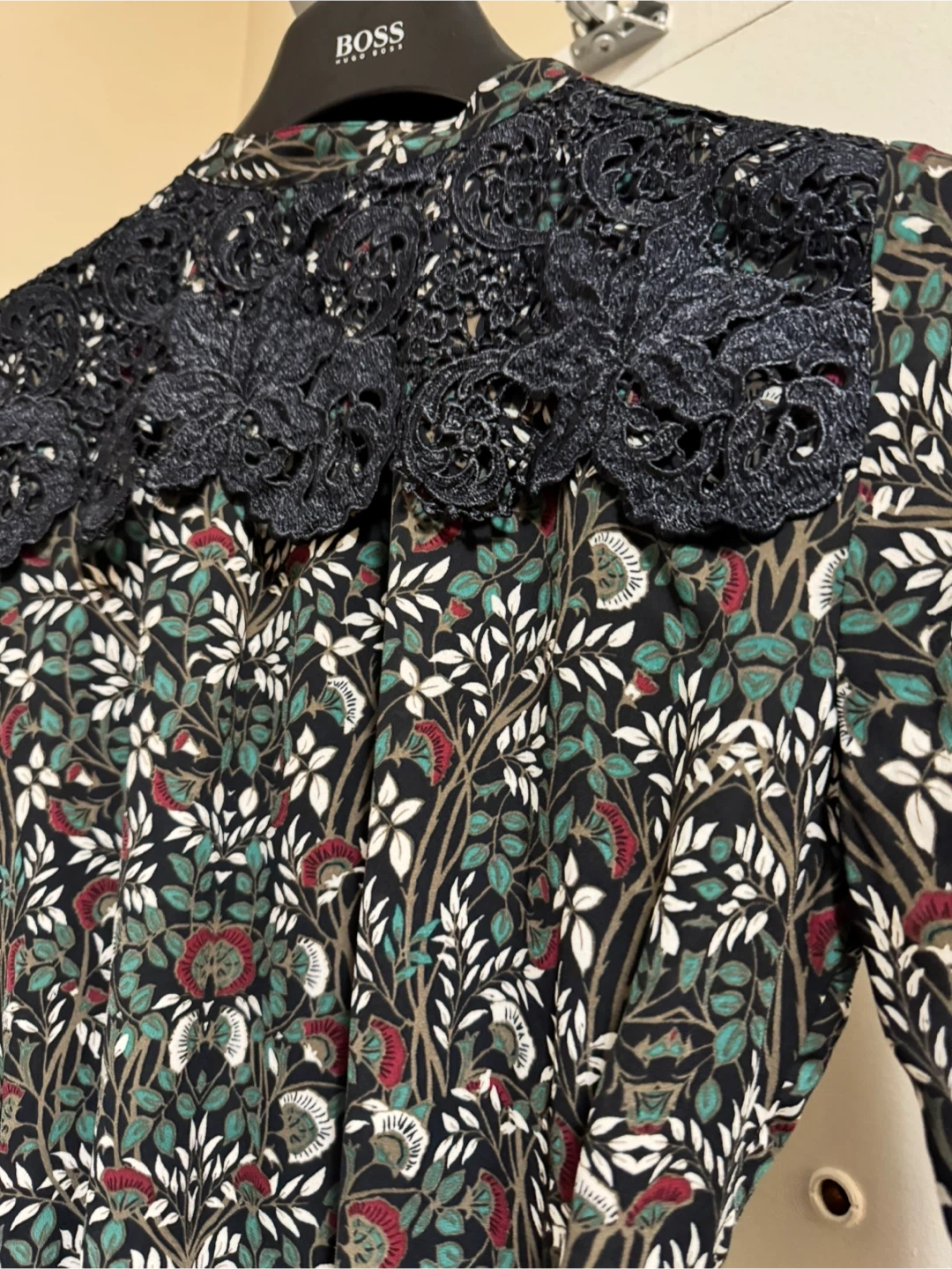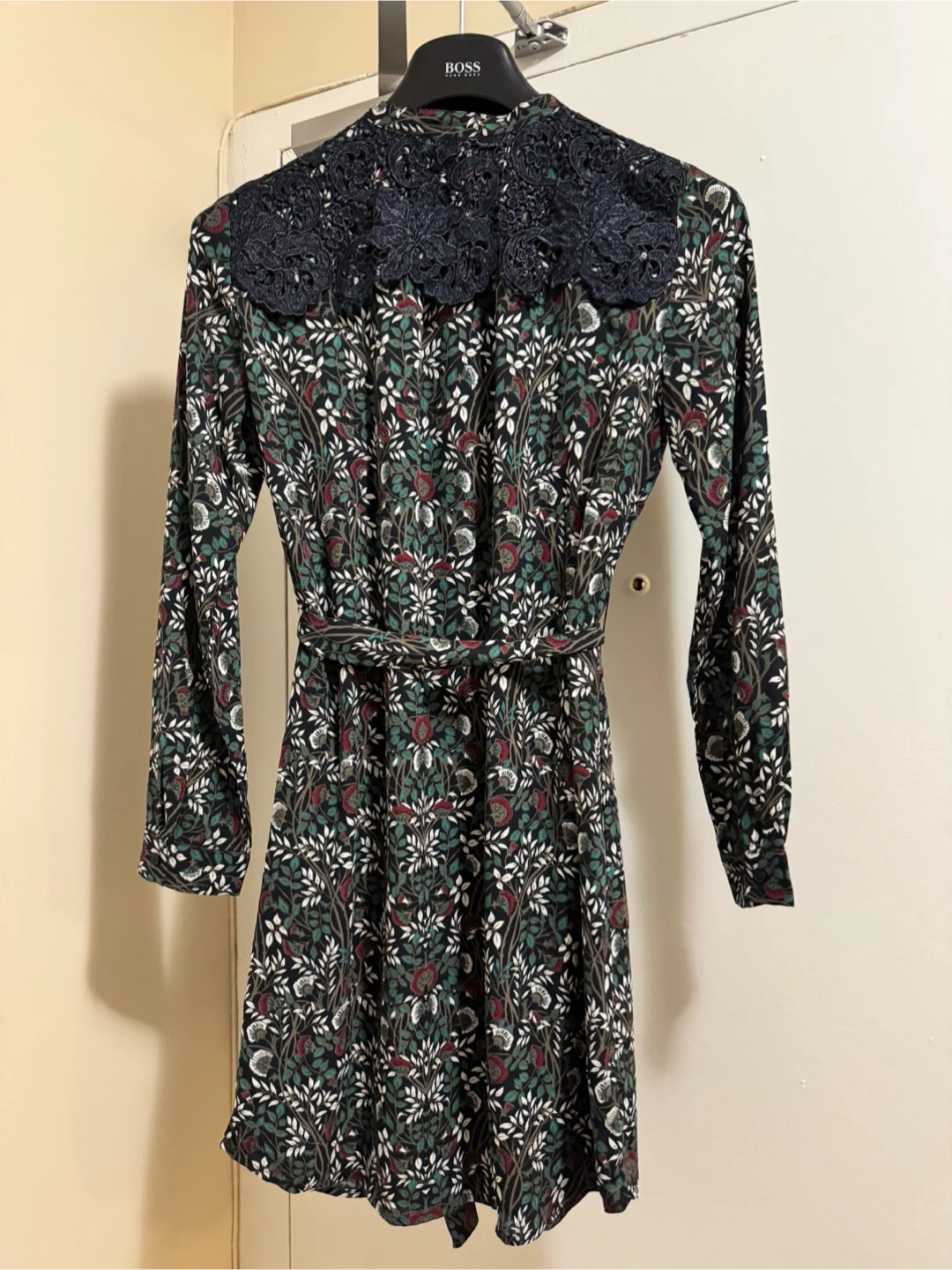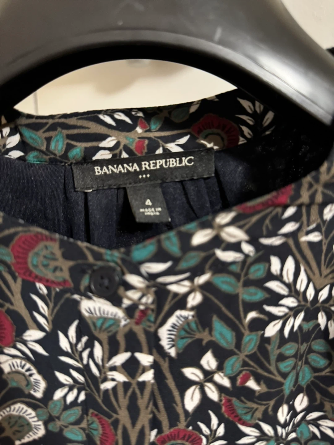 Here's a beautiful Banana Republic dress in size 4! It features a lovely floral pattern and a stylish lace collar. Perfect for any occasion!