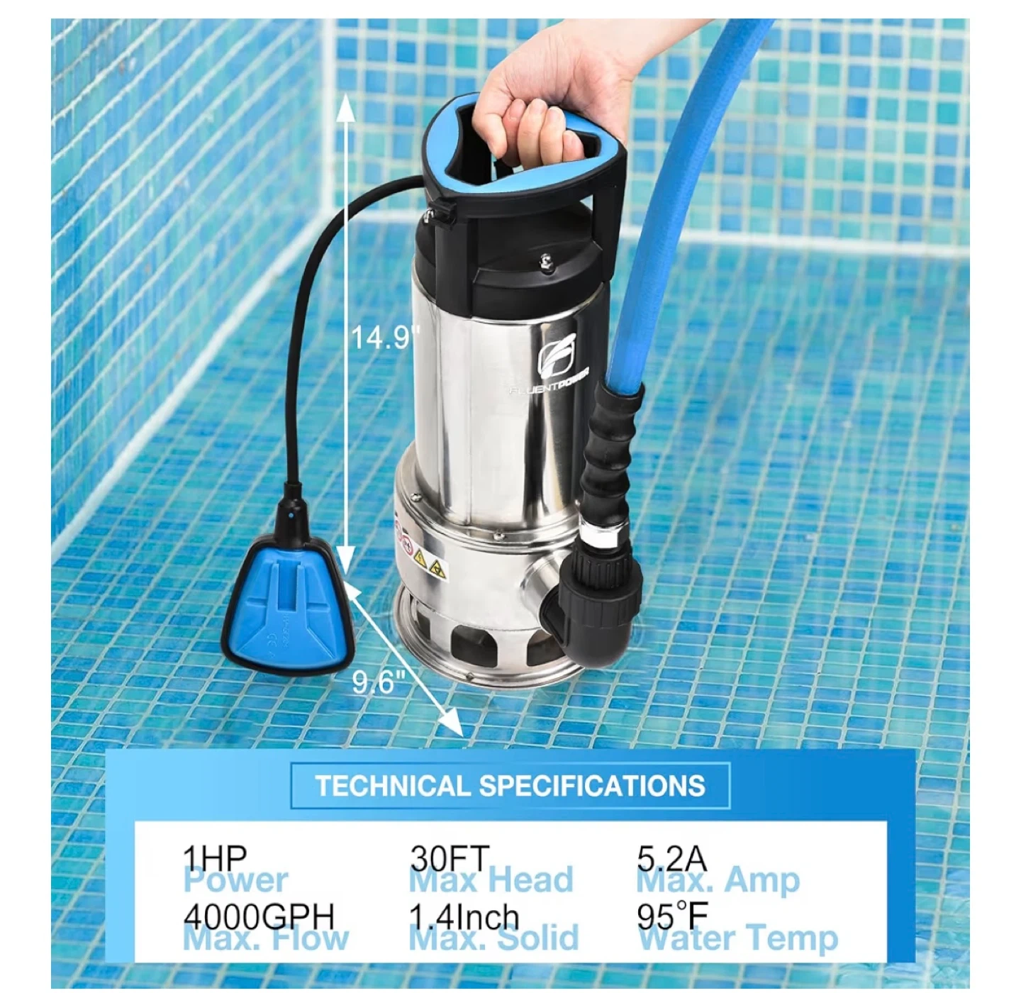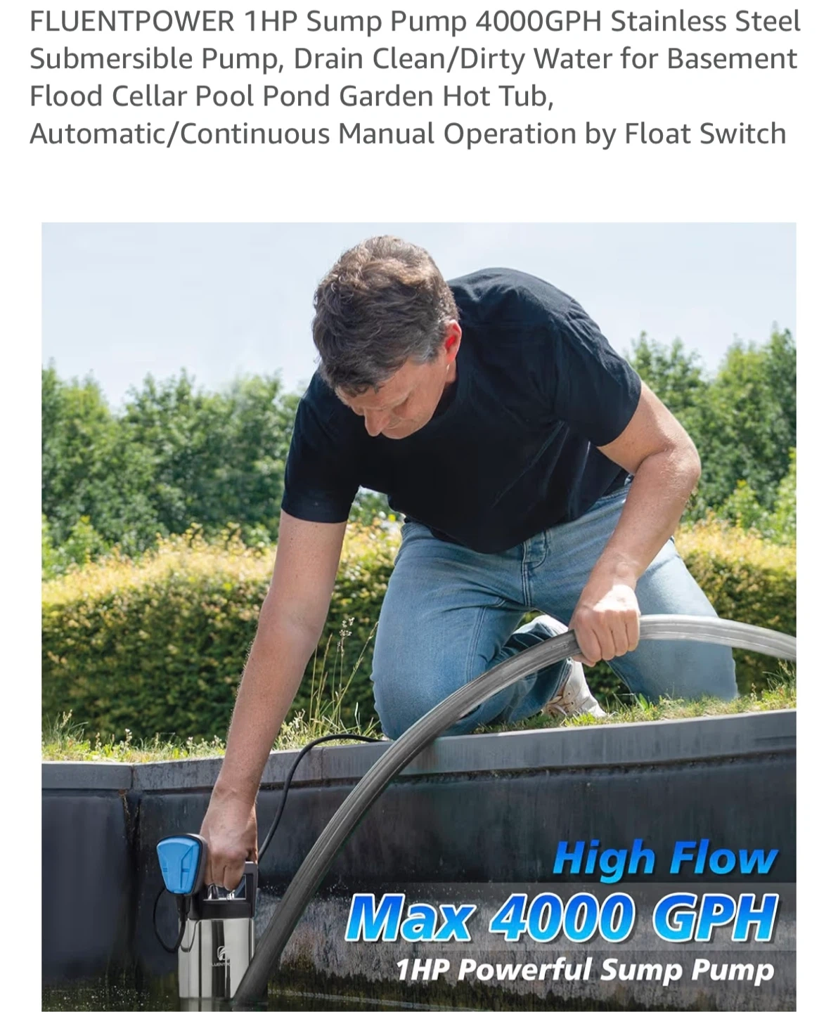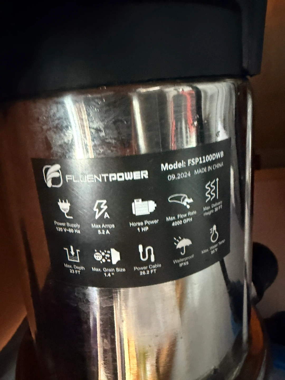 Selling a NEW FLUENTPOWER 1HP sump pump. It's a stainless steel submersible pump with a 4000GPH flow rate. Perfect for removing water from basements, cellars, pools, ponds, gardens, and hot tubs. It can handle both clean and dirty water, and has automatic/continuous manual operation with a float switch. Model number is FSP1100DWB. It was manufactured in 2024 September.