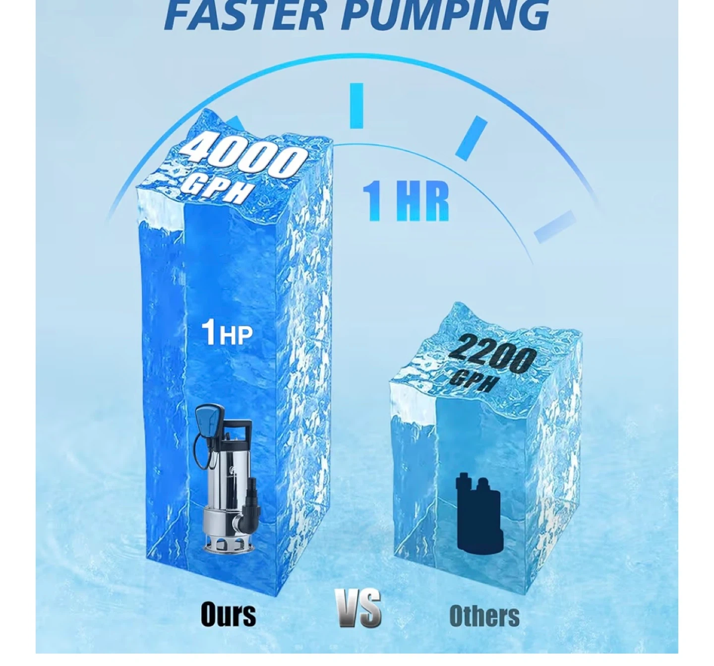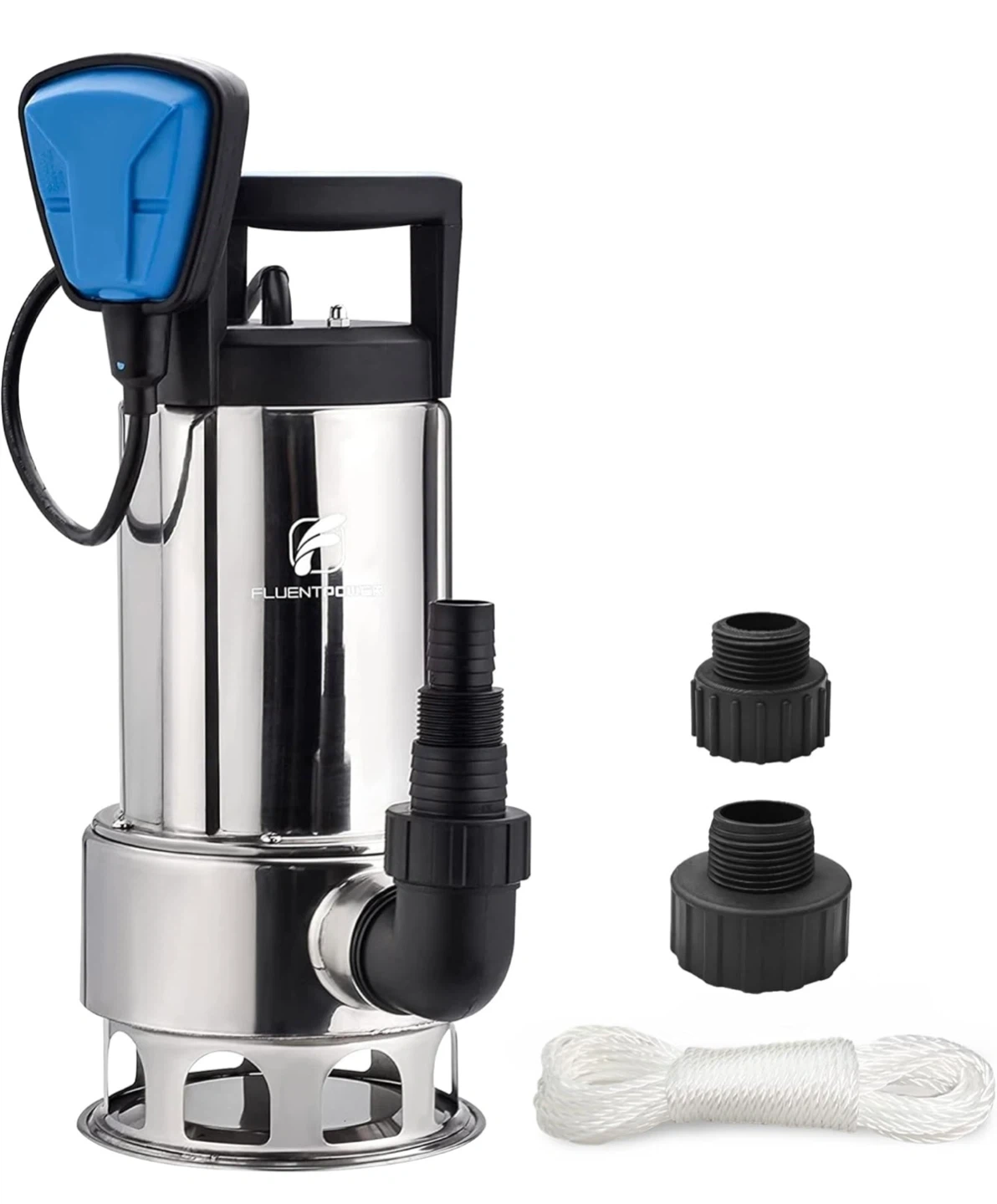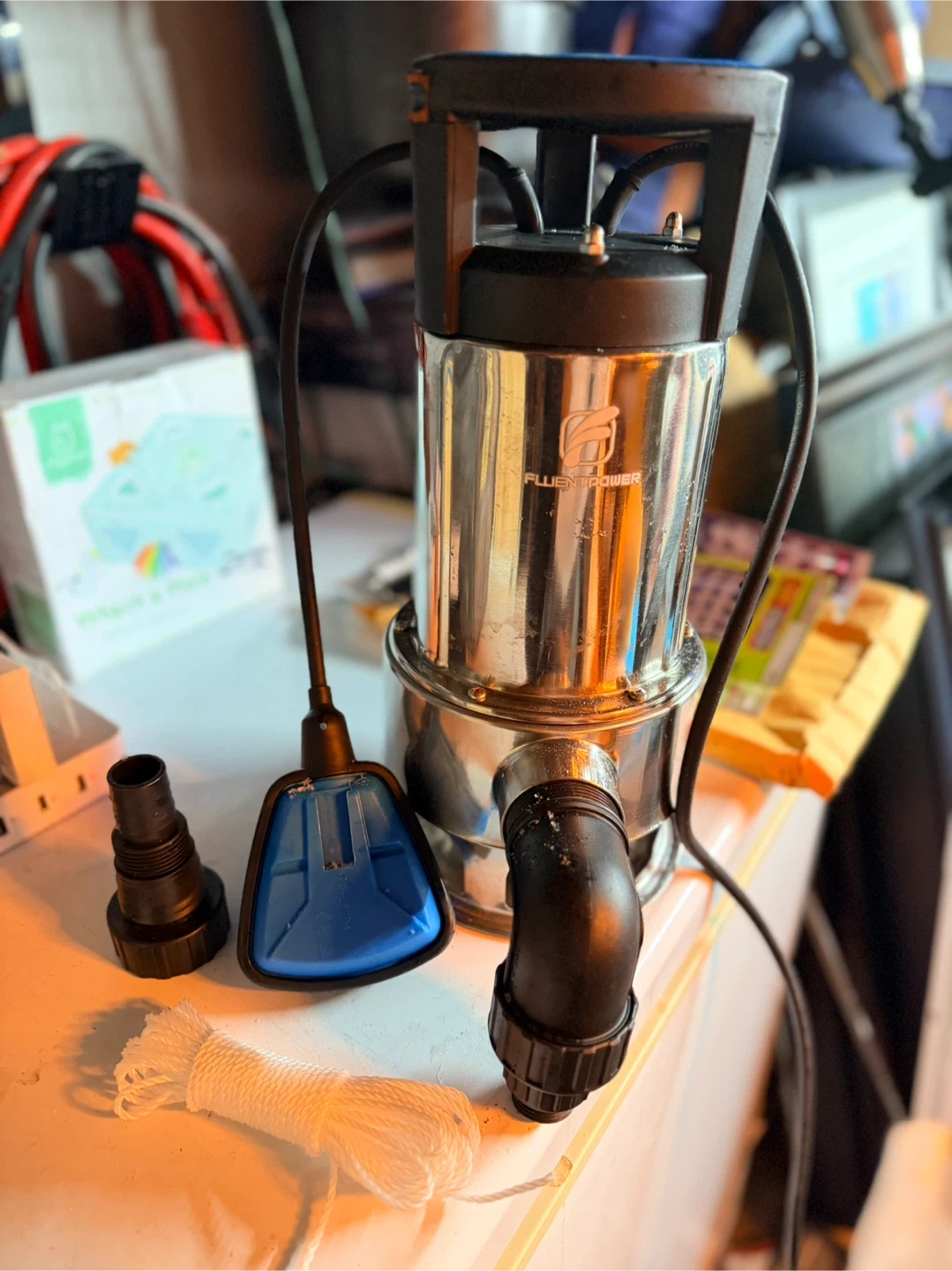 Selling a NEW FLUENTPOWER 1HP sump pump. It's a stainless steel submersible pump with a 4000GPH flow rate. Perfect for removing water from basements, cellars, pools, ponds, gardens, and hot tubs. It can handle both clean and dirty water, and has automatic/continuous manual operation with a float switch. Model number is FSP1100DWB. It was manufactured in 2024 September.