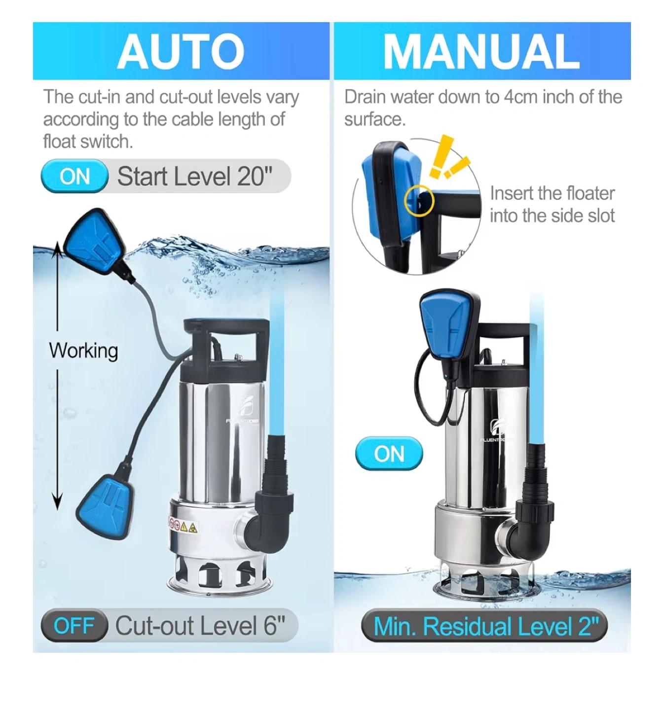 Selling a NEW FLUENTPOWER 1HP sump pump. It's a stainless steel submersible pump with a 4000GPH flow rate. Perfect for removing water from basements, cellars, pools, ponds, gardens, and hot tubs. It can handle both clean and dirty water, and has automatic/continuous manual operation with a float switch. Model number is FSP1100DWB. It was manufactured in 2024 September.
