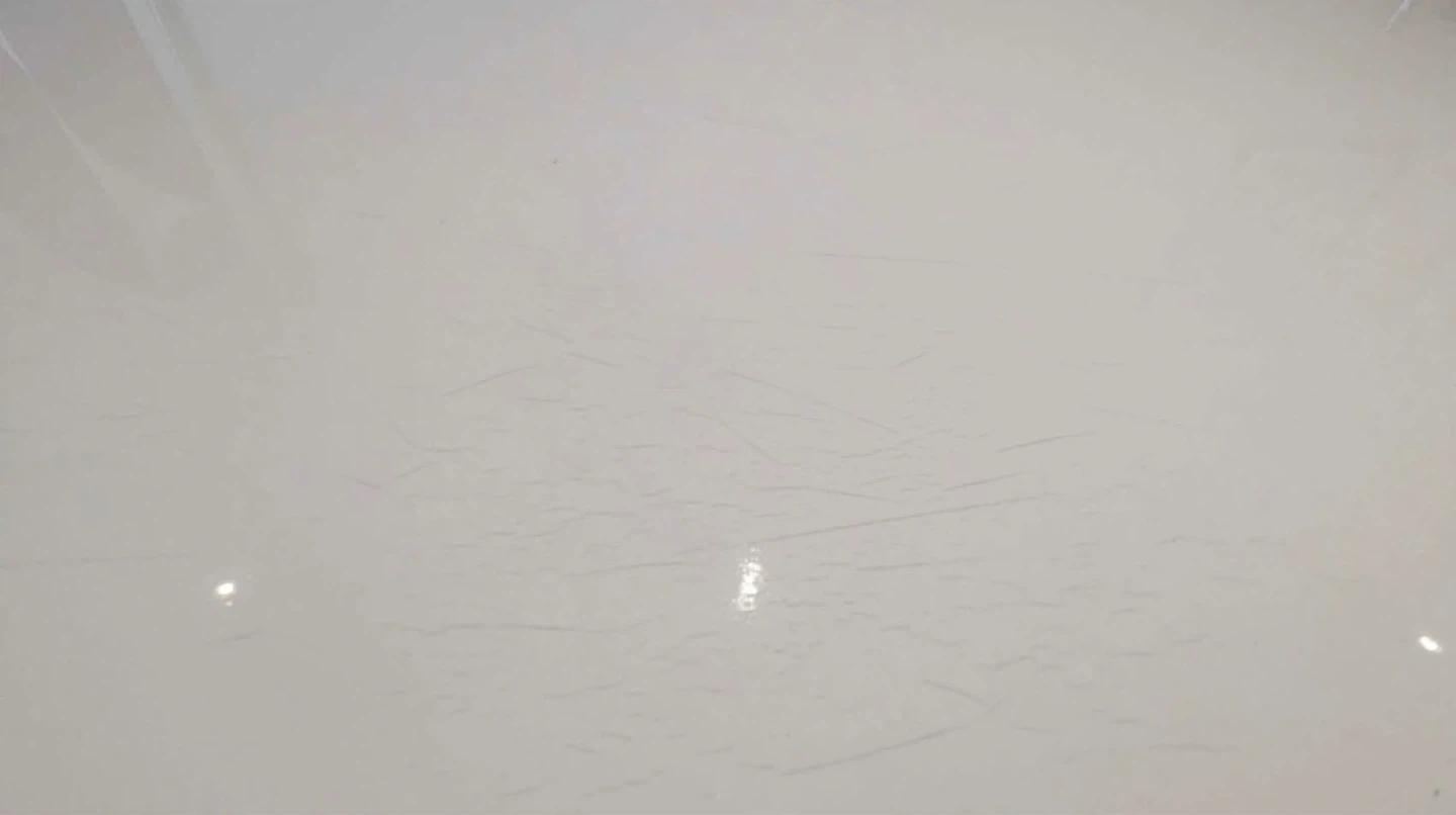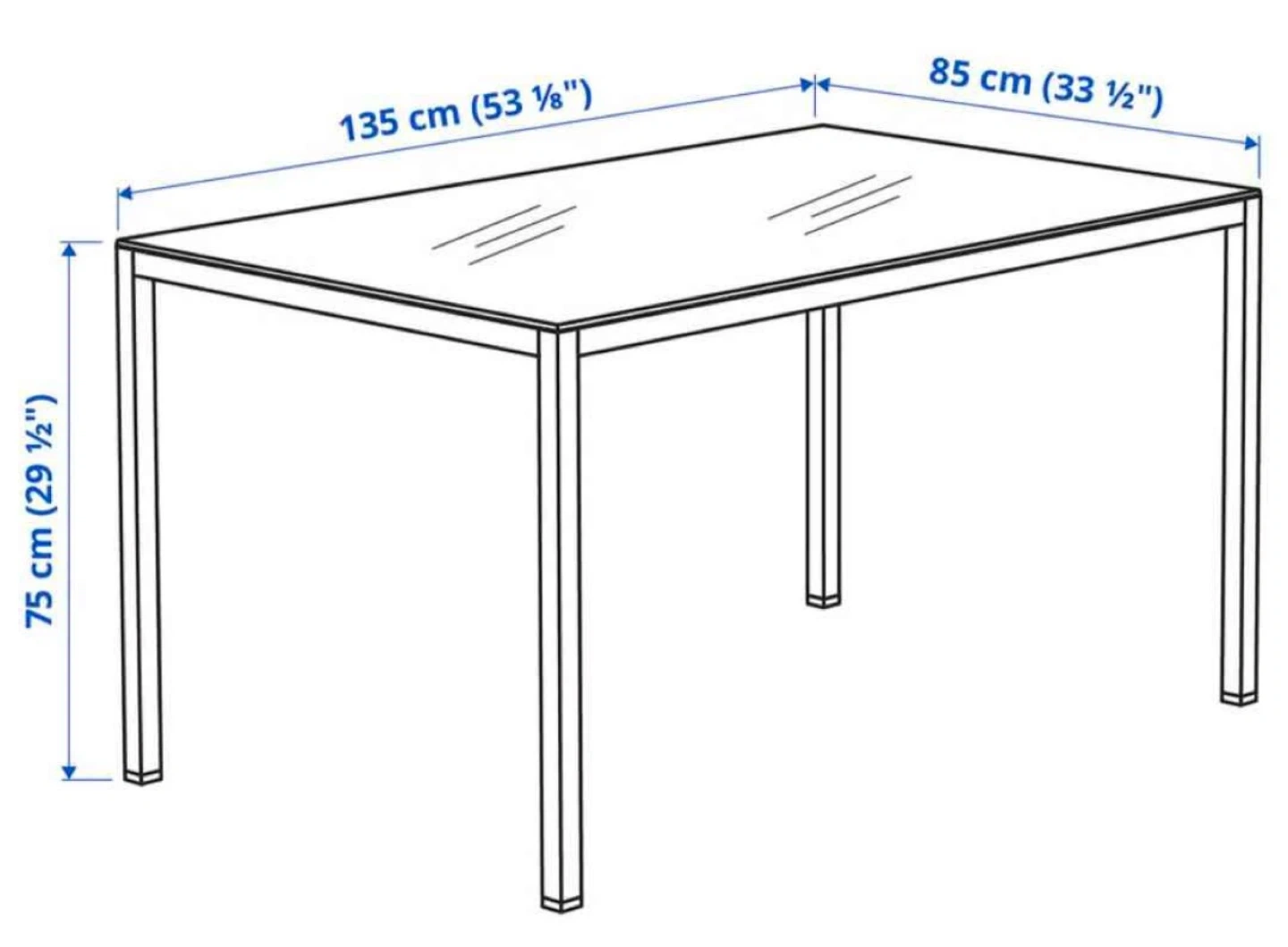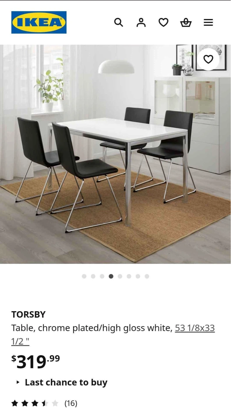 A rectangular dining table with a high gloss white top and chrome-plated legs. It measures 135 cm in length, 85 cm in width, and 75 cm in height. This table's simple design makes it a versatile addition to a dining area. The top has a number of cosmetic scratches due to general wear and tear.