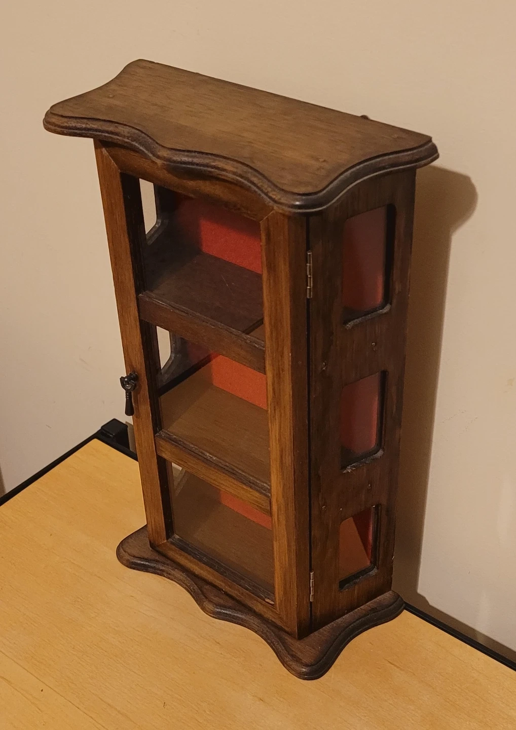 Small antique 3 tier display Cabinet with red velvet backing. In good condition.