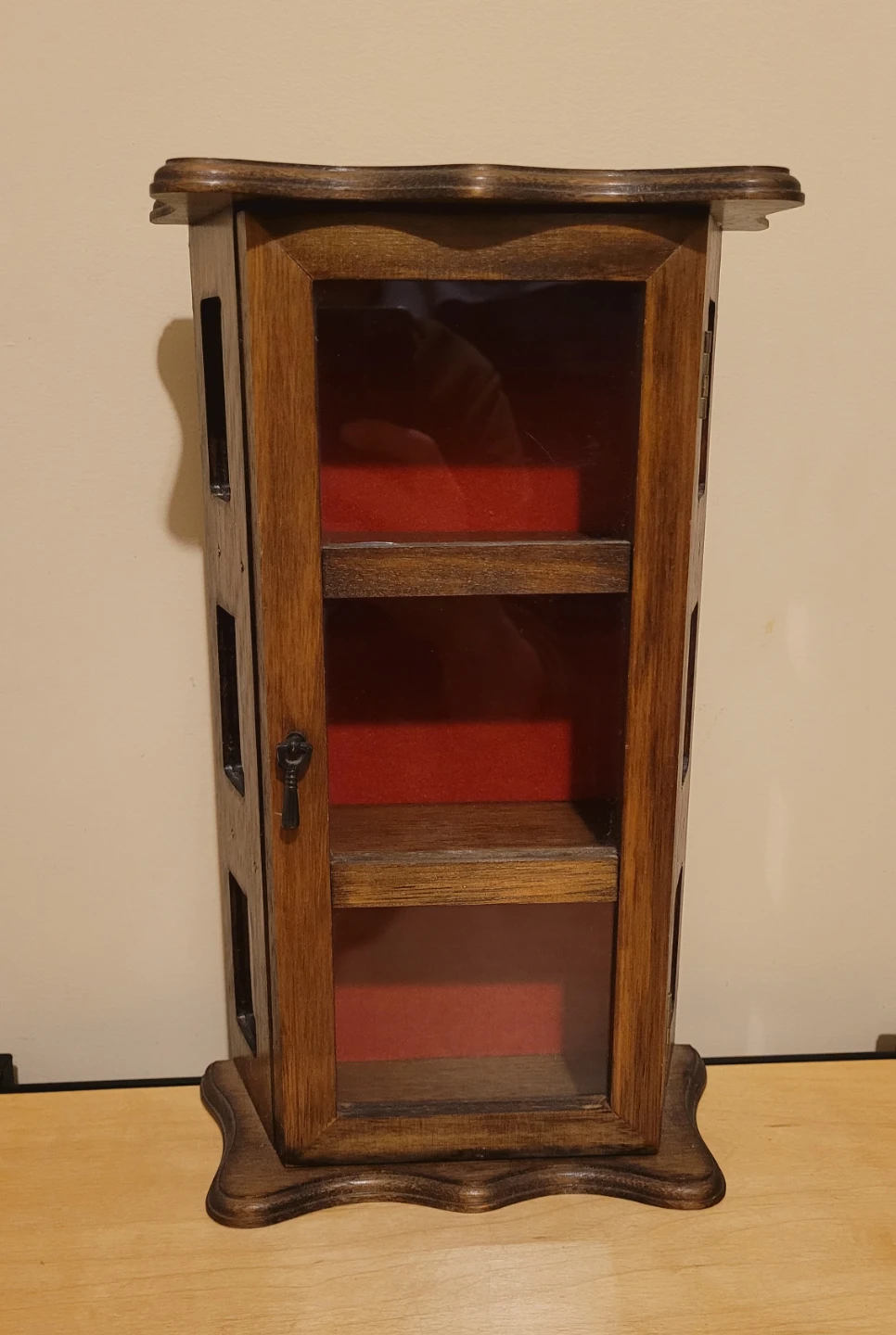 Small antique 3 tier display Cabinet with red velvet backing. In good condition.