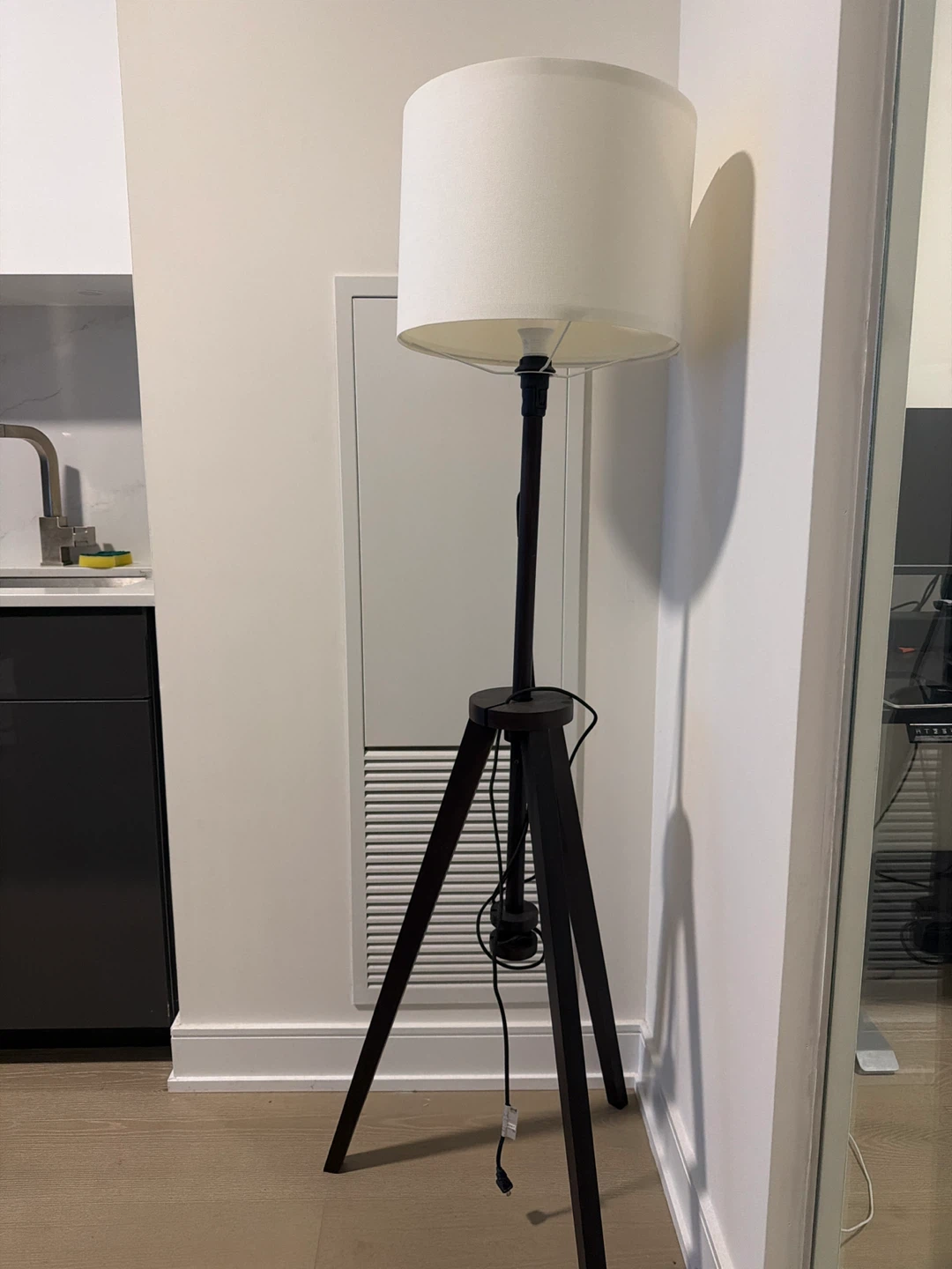 Selling a stylish tripod floor lamp! The legs are dark brown and the shade is a clean white. It's in great condition and would look lovely in any living room or bedroom. It provides a nice ambient light
