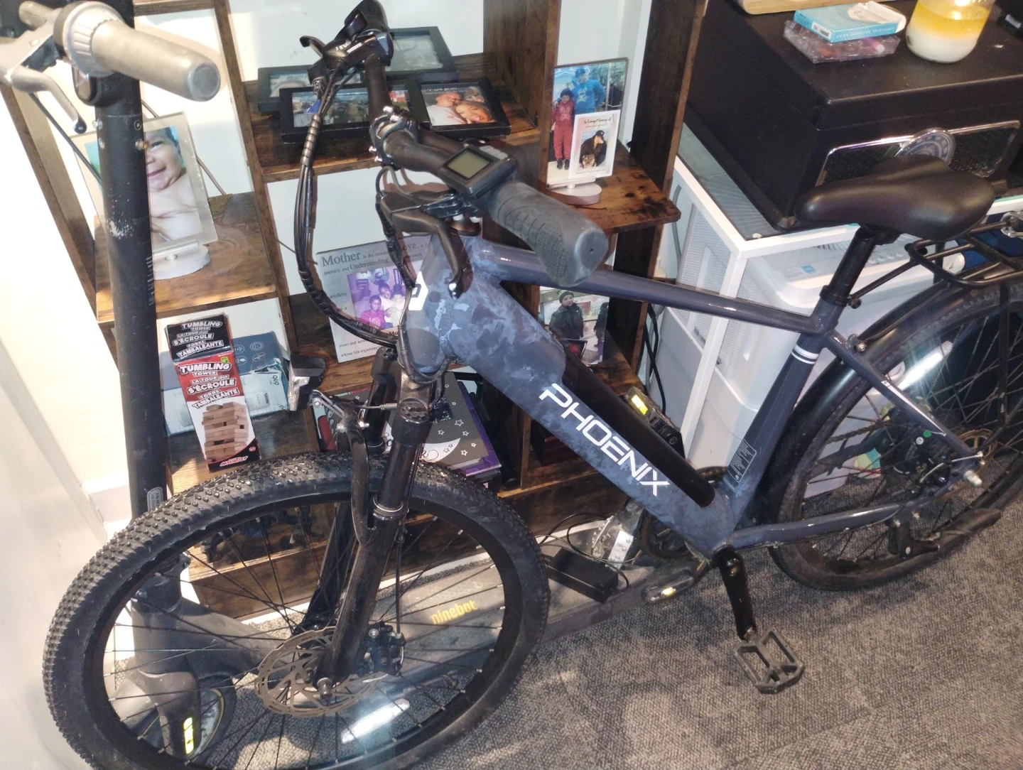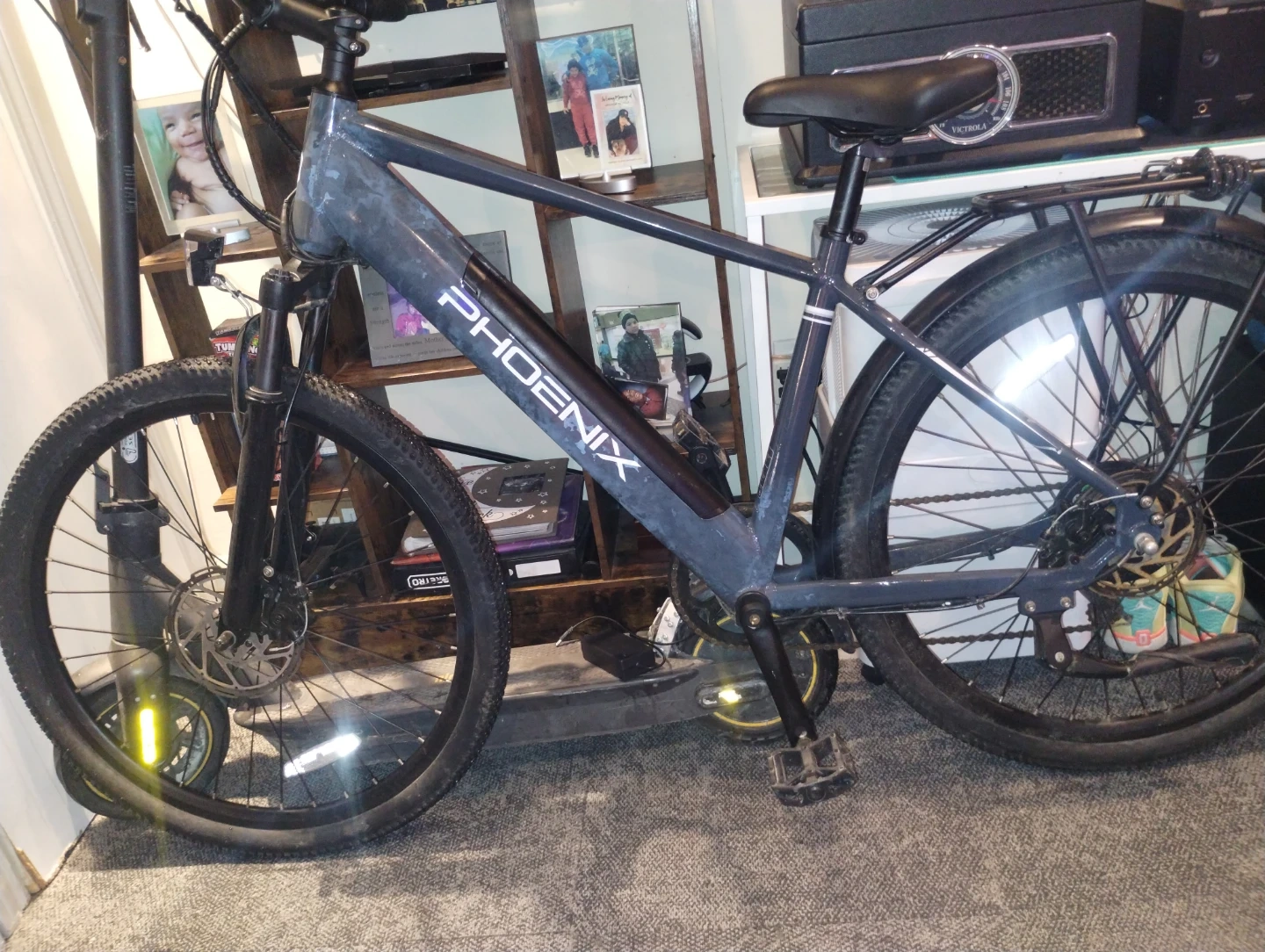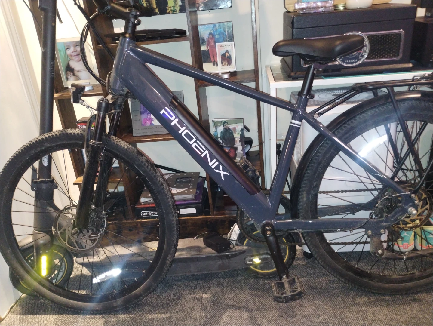 This is a Phoenix electric bicycle, great for getting around town or on trails. It's a sturdy bike with a powerful motor. The frame is made of durable aluminum.