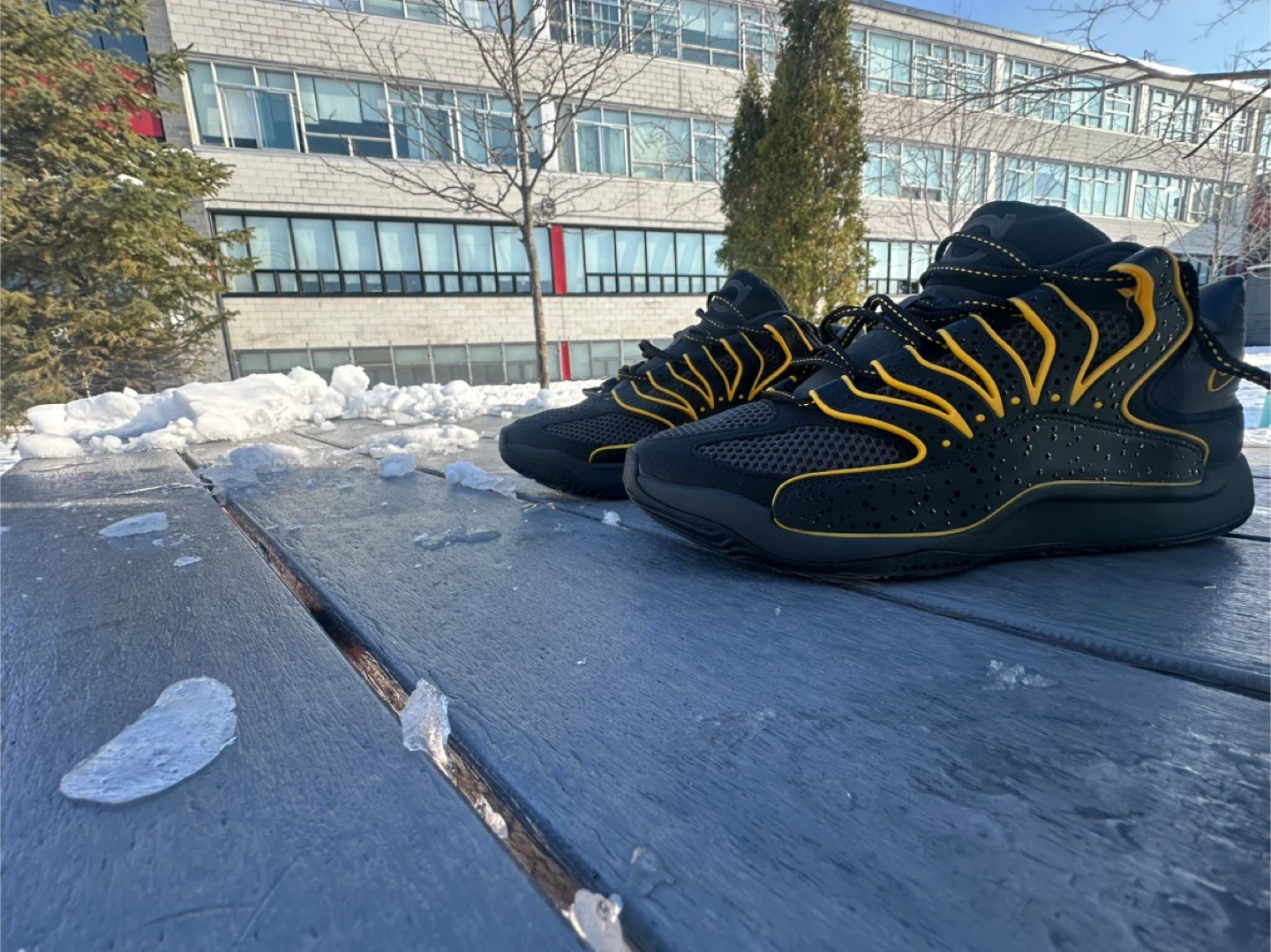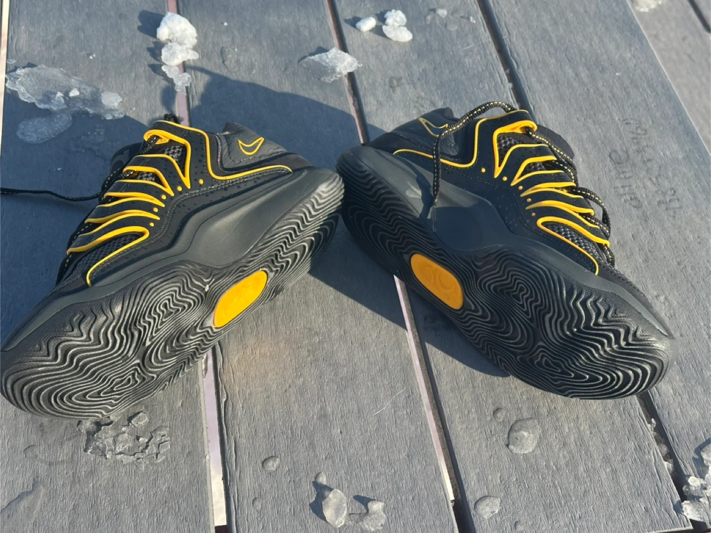 These Nike KD 14 basketball shoes are black with yellow accents. They're built for performance on the court. Features a secure fit and supportive design for dynamic play.