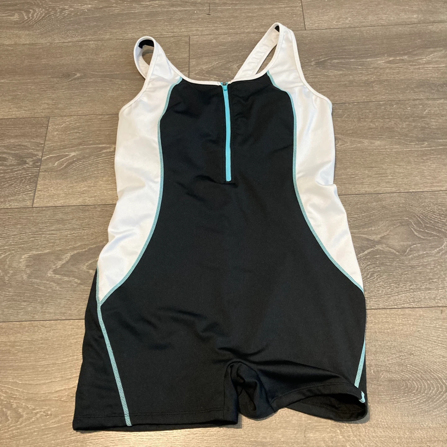 This is a women's athletic swimsuit bodysuit. It features a black front and back with white side panels and a light blue zipper. It's designed for performance and comfort. The material is a blend for durability and stretch.