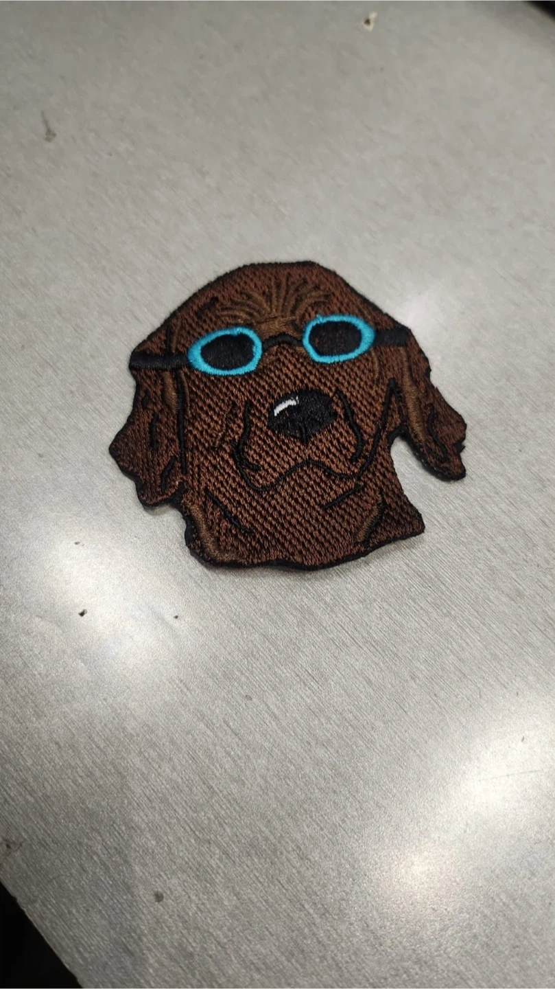 Cute embroidered patch featuring a brown dog wearing blue sunglasses. This iron-on patch is perfect for customizing jackets, bags, or hats. It's made from durable embroidered fabric.