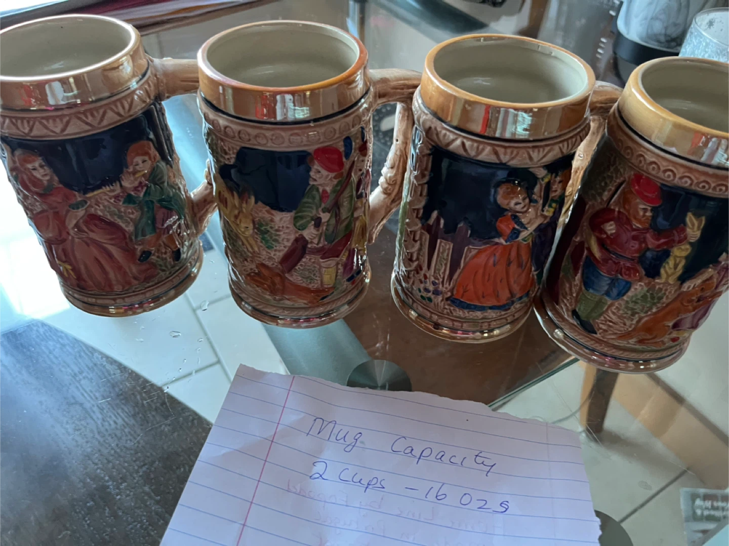 Selling a set of four vintage ceramic beer stein mugs! They feature a detailed design and each mug holds approximately 2 cups (16 oz). These would be a great addition to any collection or for enjoying your favourite beverage