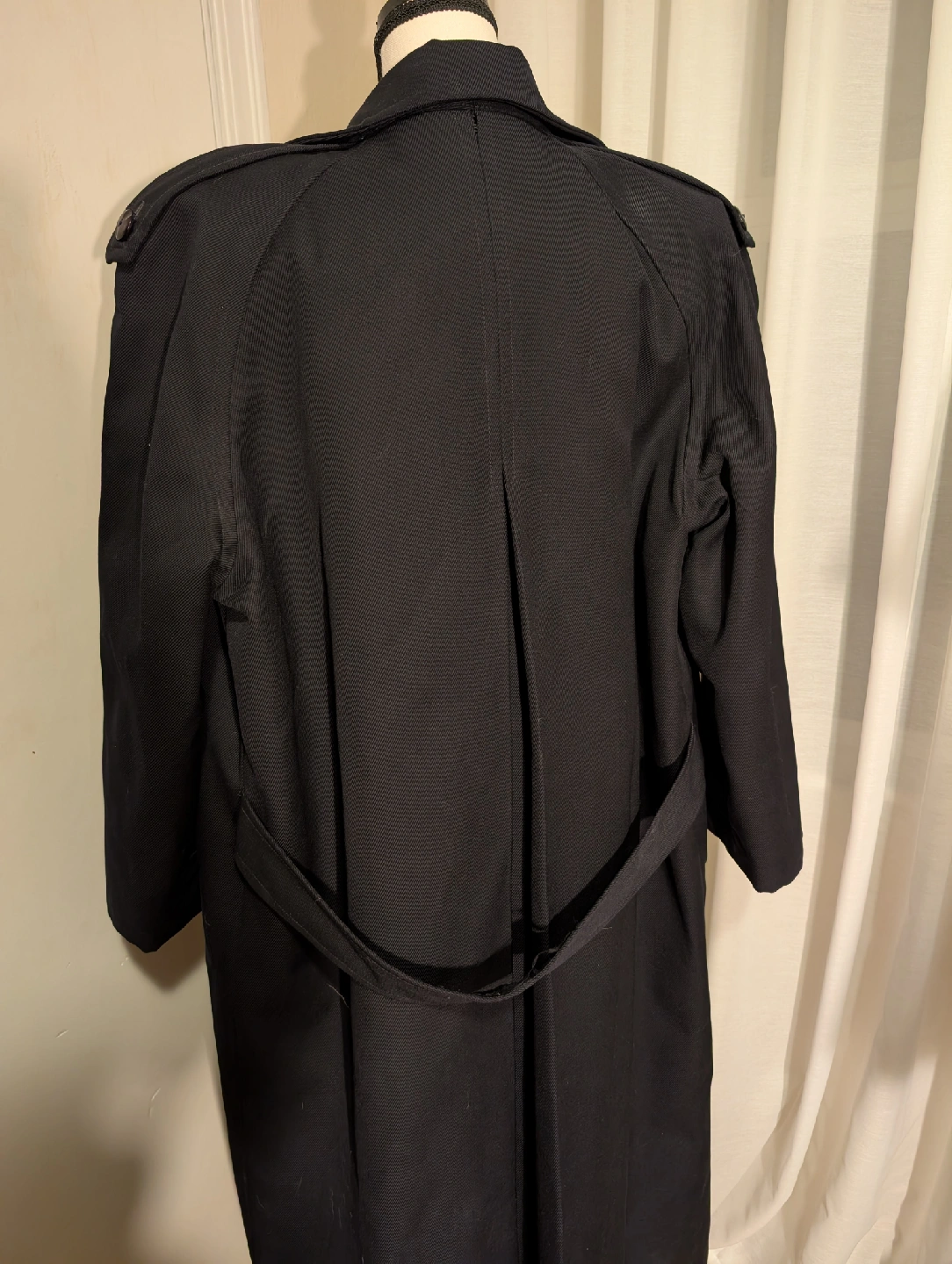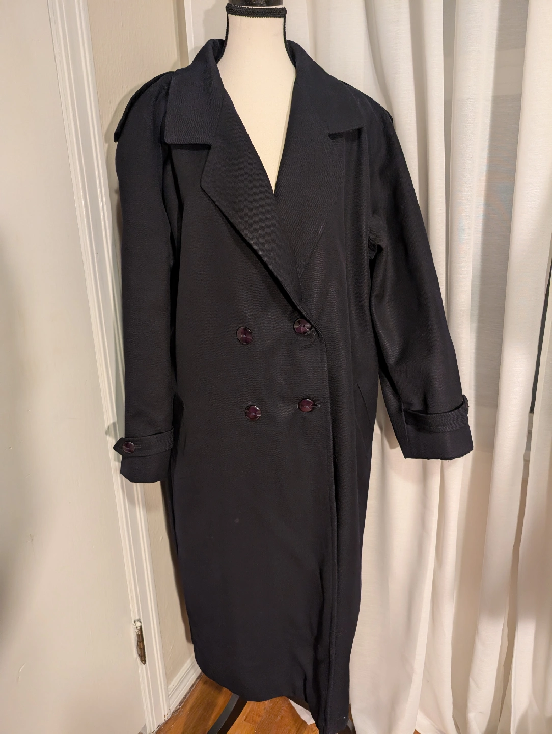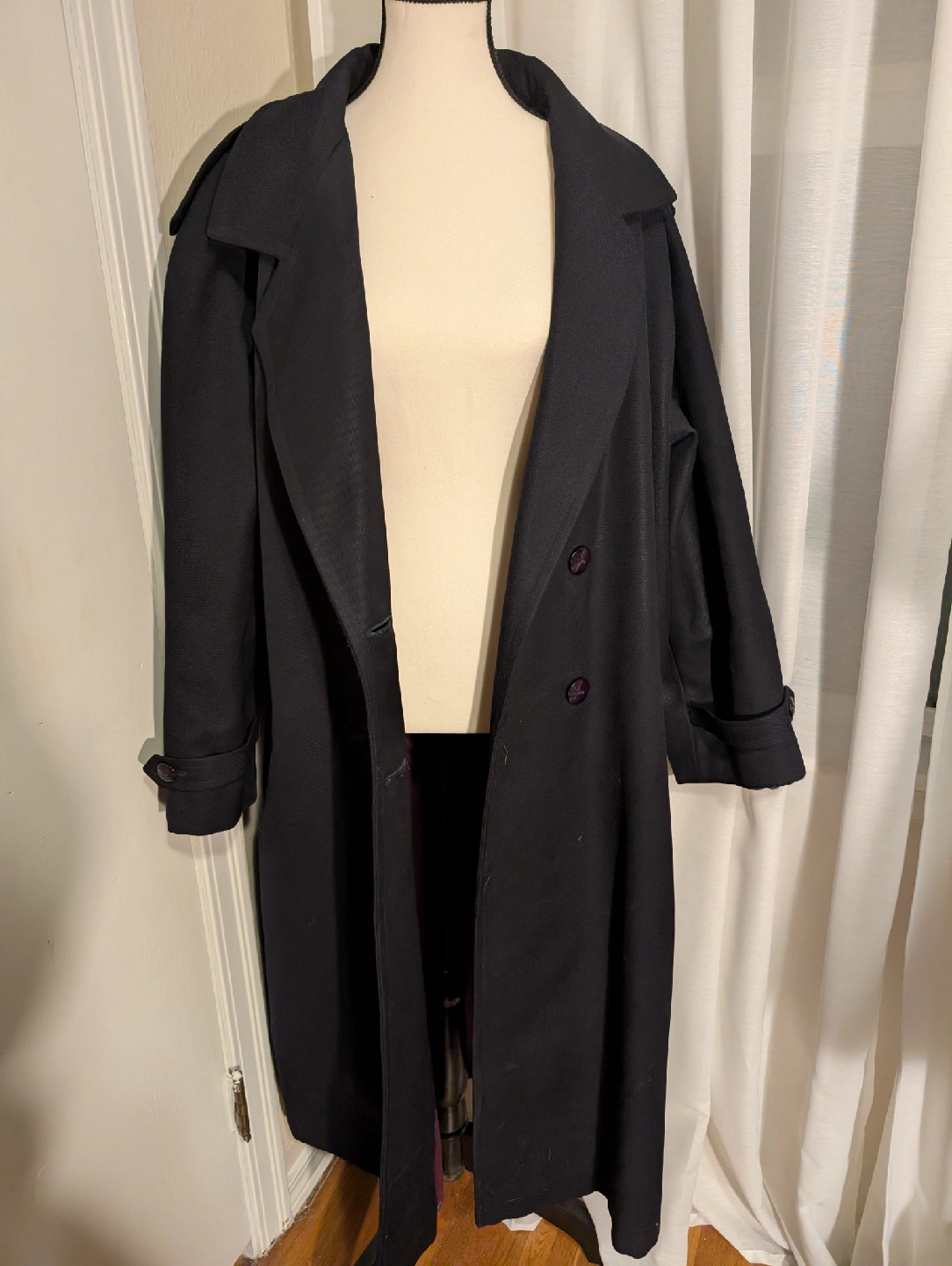 Classic Navy trench coat in great condition! The material feels durable and the lining is a beautiful burgundy colour. Perfect for fall or spring weather. Has a stylish and timeless look! Some wear on interior lining, and seams (hem etc)