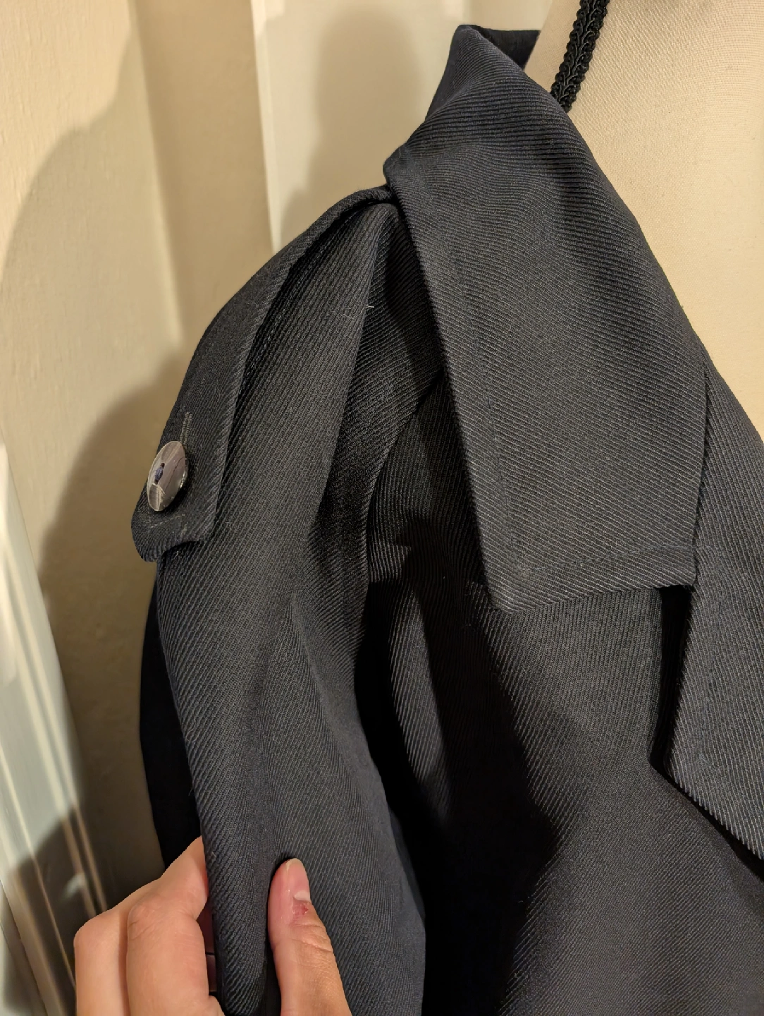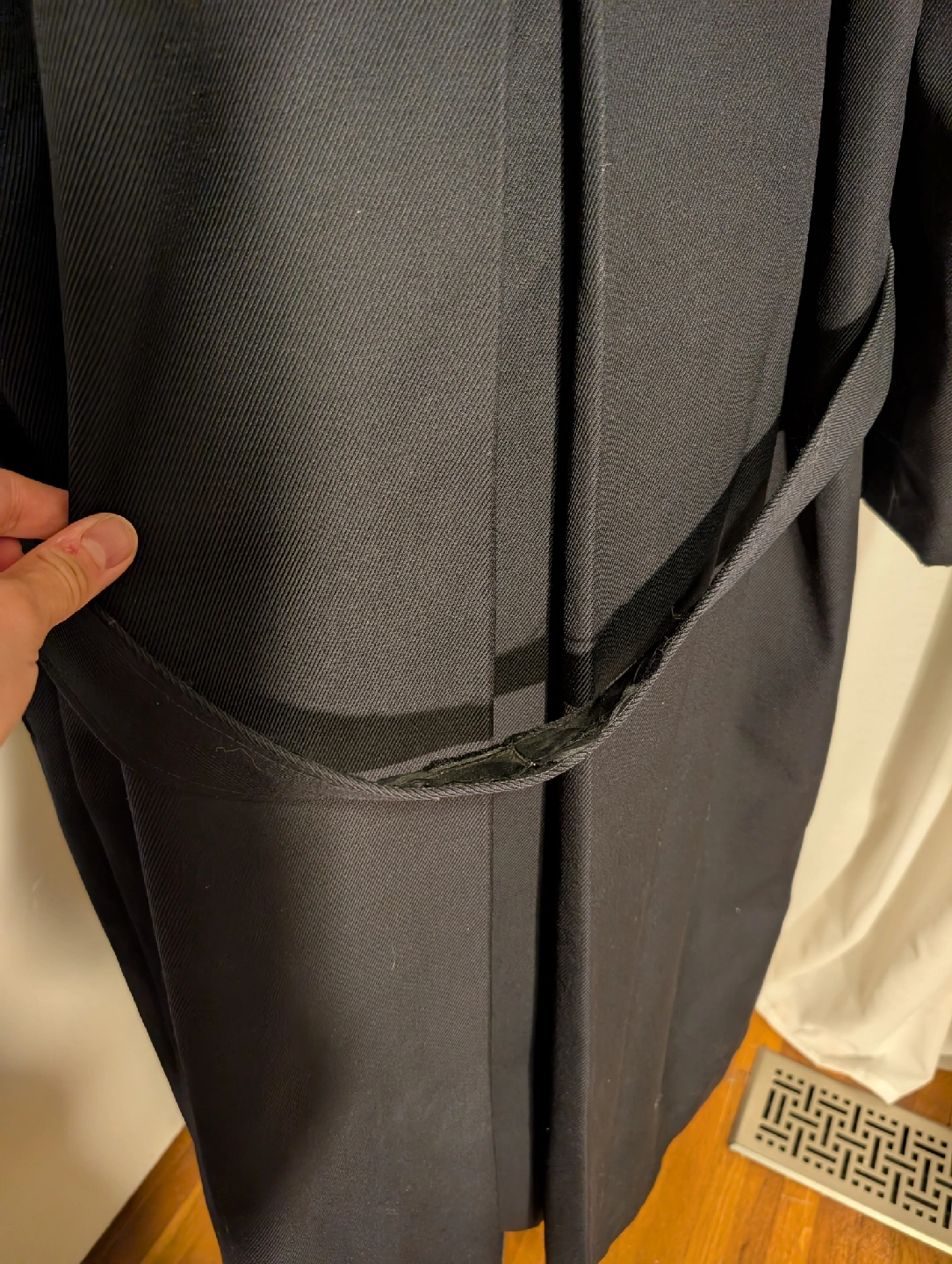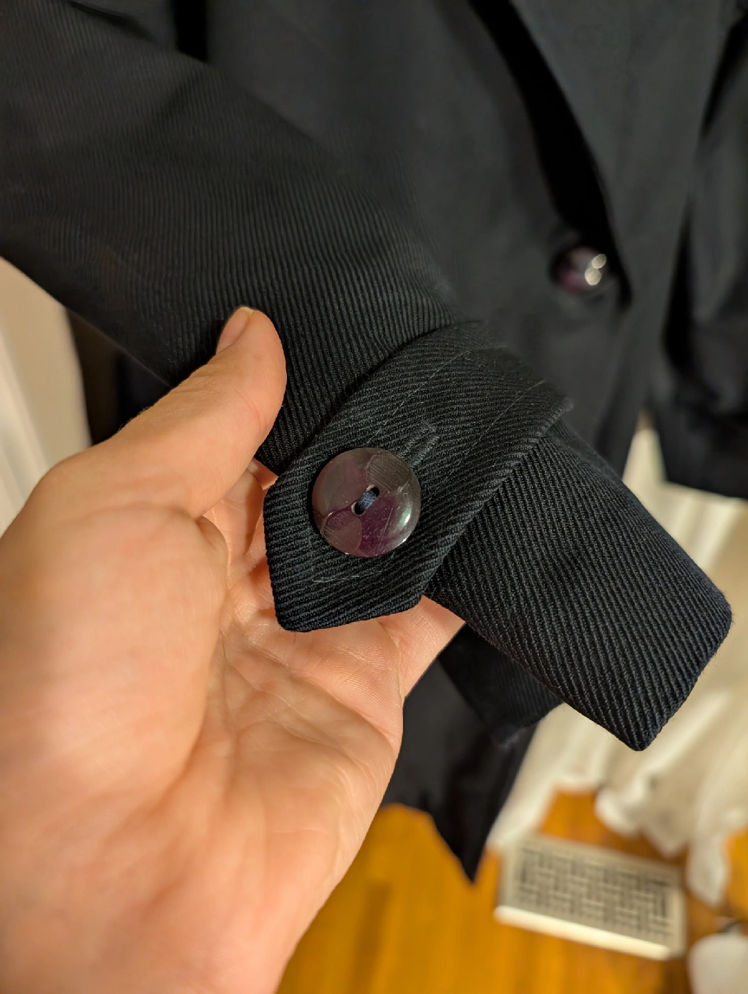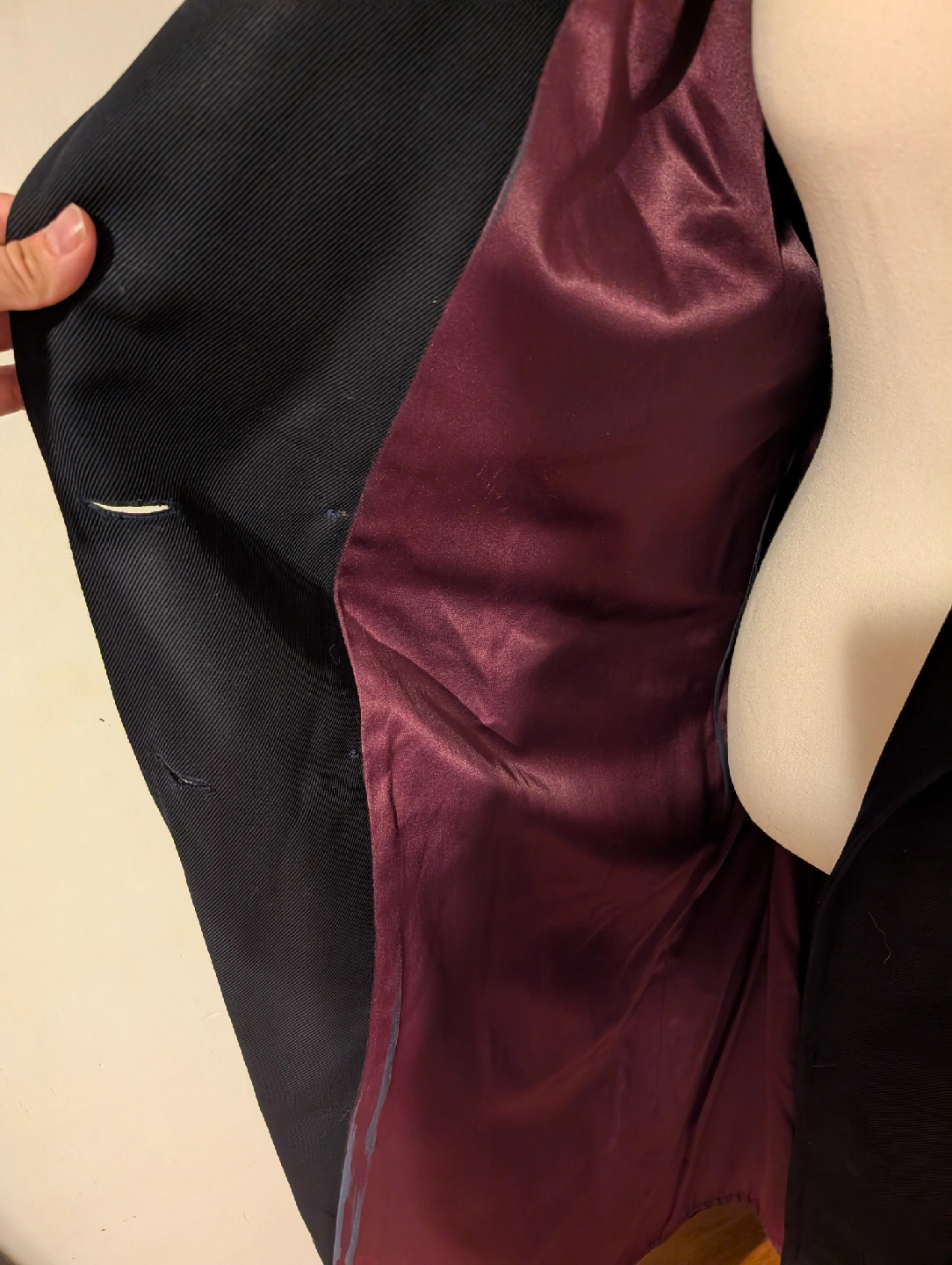 Classic Navy trench coat in great condition! The material feels durable and the lining is a beautiful burgundy colour. Perfect for fall or spring weather. Has a stylish and timeless look! Some wear on interior lining, and seams (hem etc)