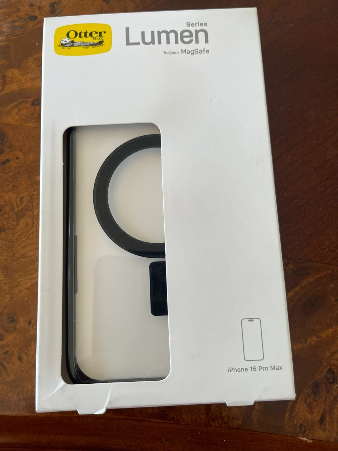This is an OtterBox Lumen Series case designed for the iPhone 16 Pro Max. It supports MagSafe compatibility. The case is clear with a black accent ring.