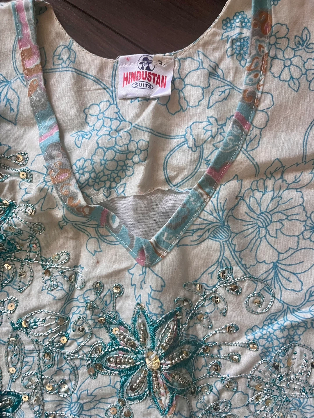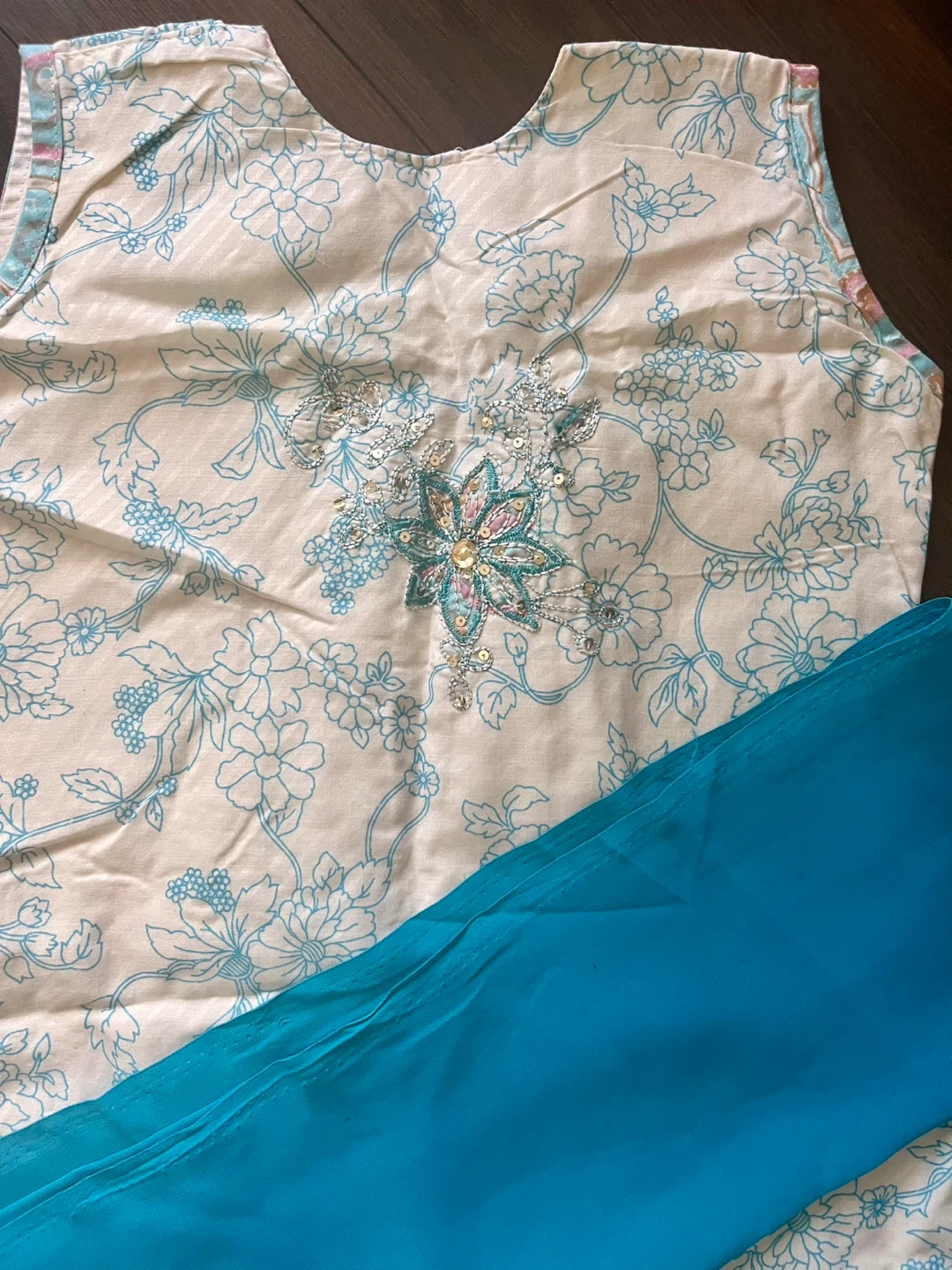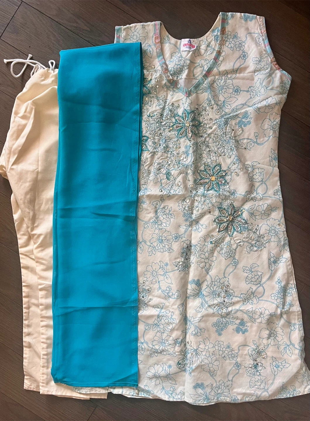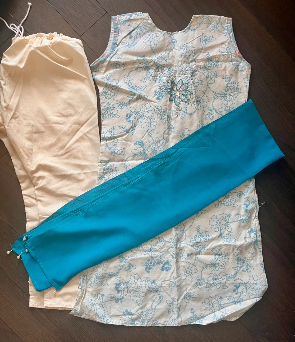 Lovely 3 piece outfit includes: pants with drawstring waist, top with embroidery on front and back, scarf with beading on hem.