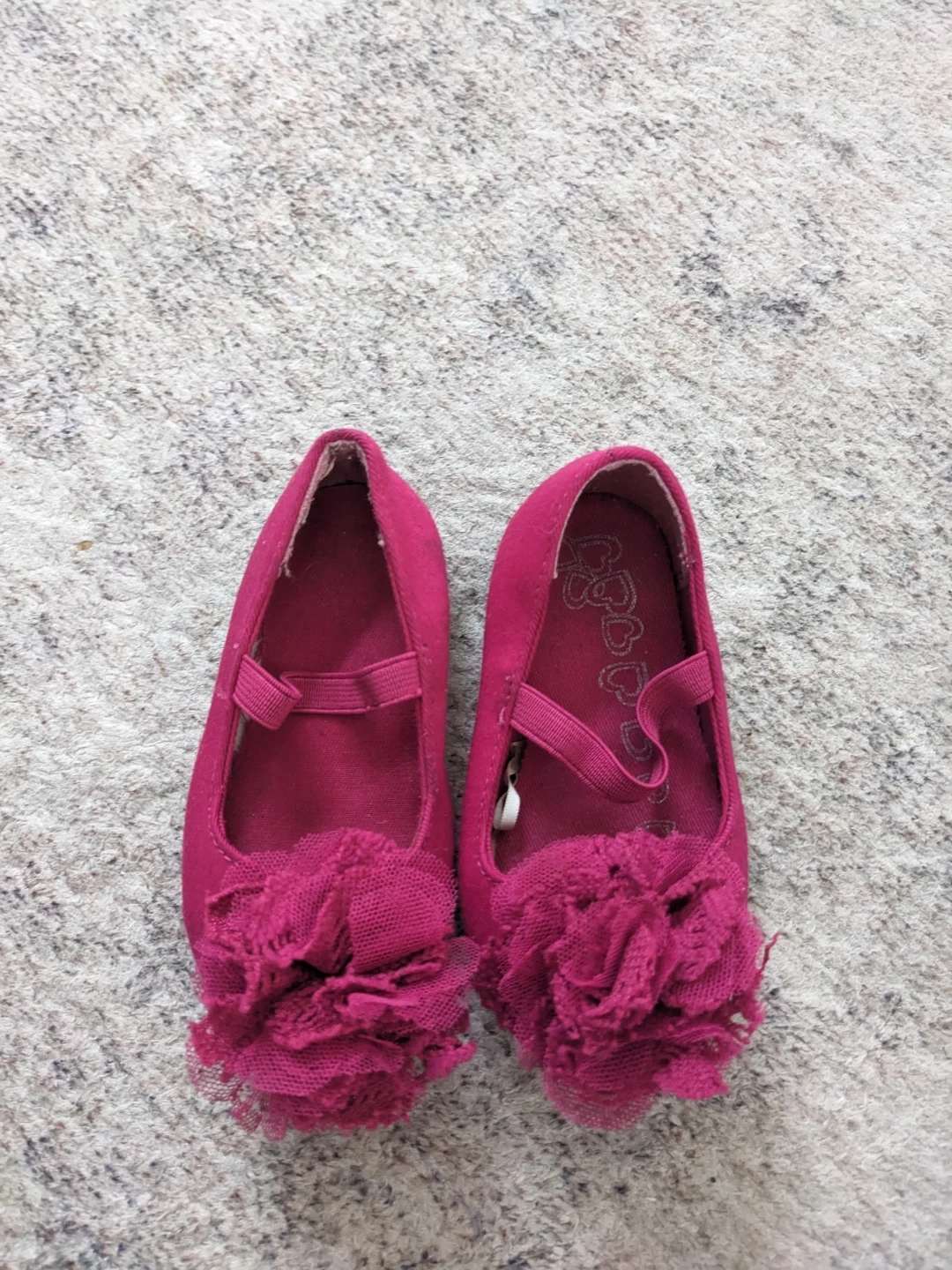 Two pairs of girls' shoes included. Black velvet flats with cute cat face embroidery and elastic strap. Pink ballet flats with floral accents and elastic strap. Both are size 5 and 6.