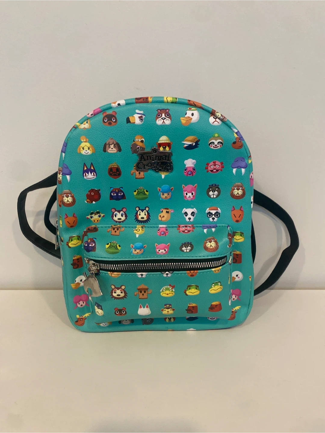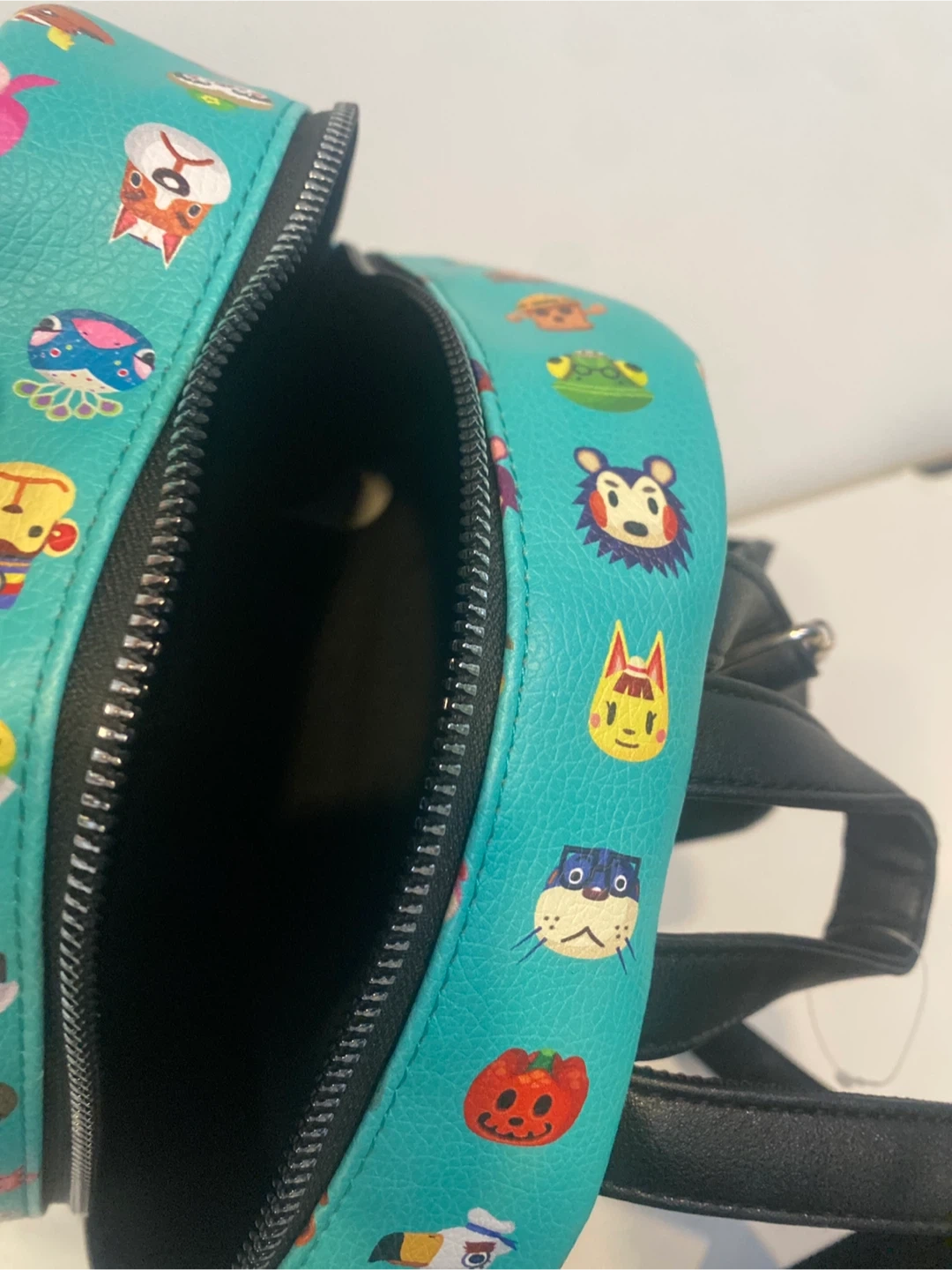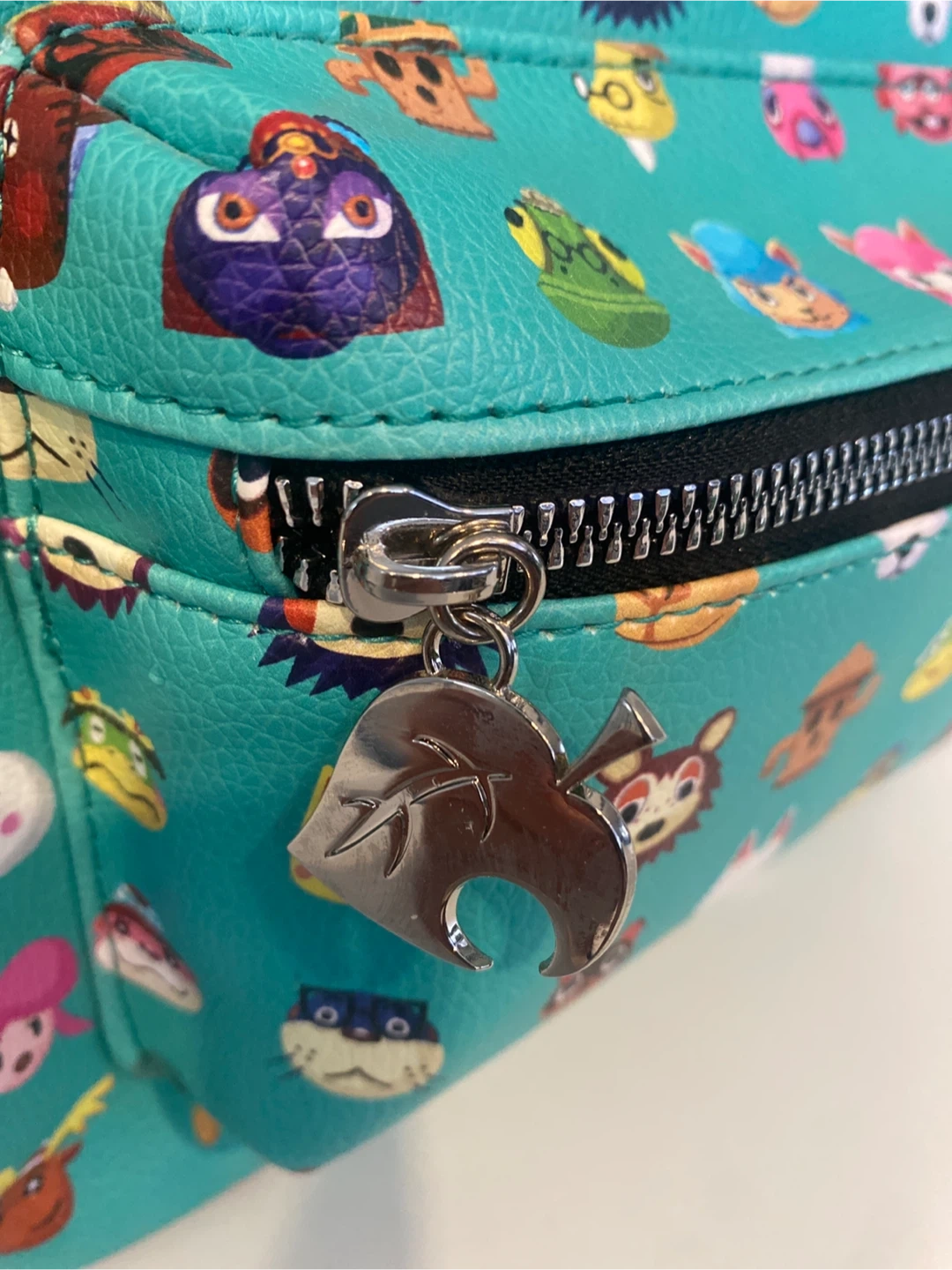 This teal mini backpack features a fun all-over print of Animal Crossing characters. It has a zippered main compartment and a small front pocket. Comes with a leaf charm zipper pull. Perfect for carrying essentials on the go!