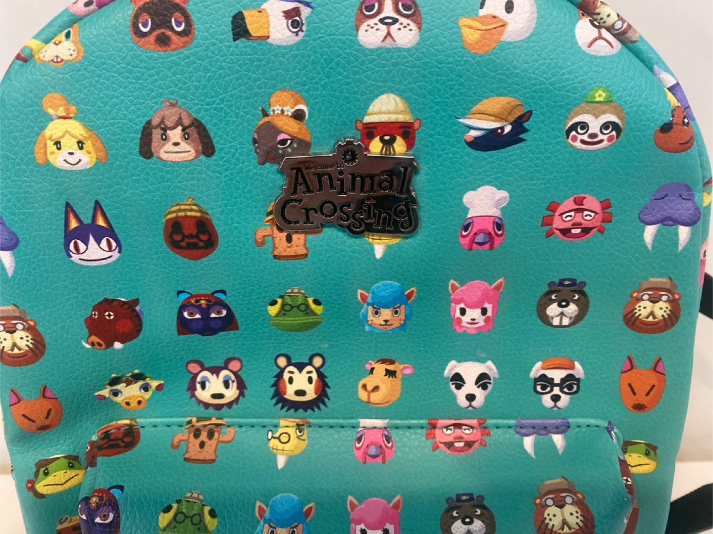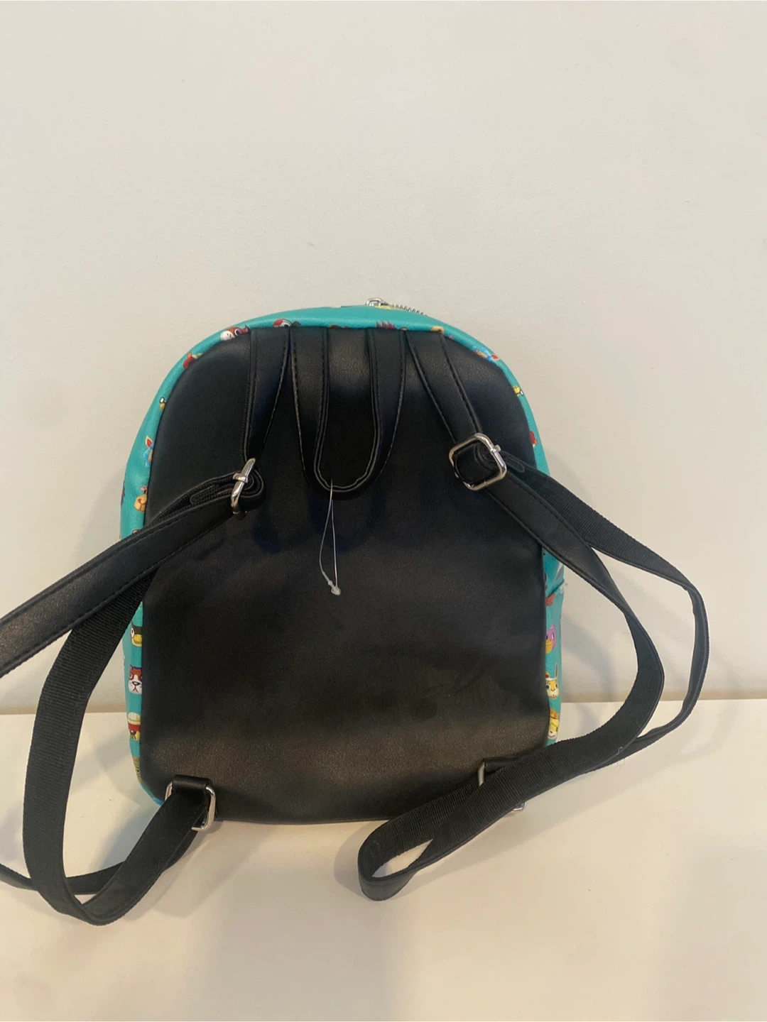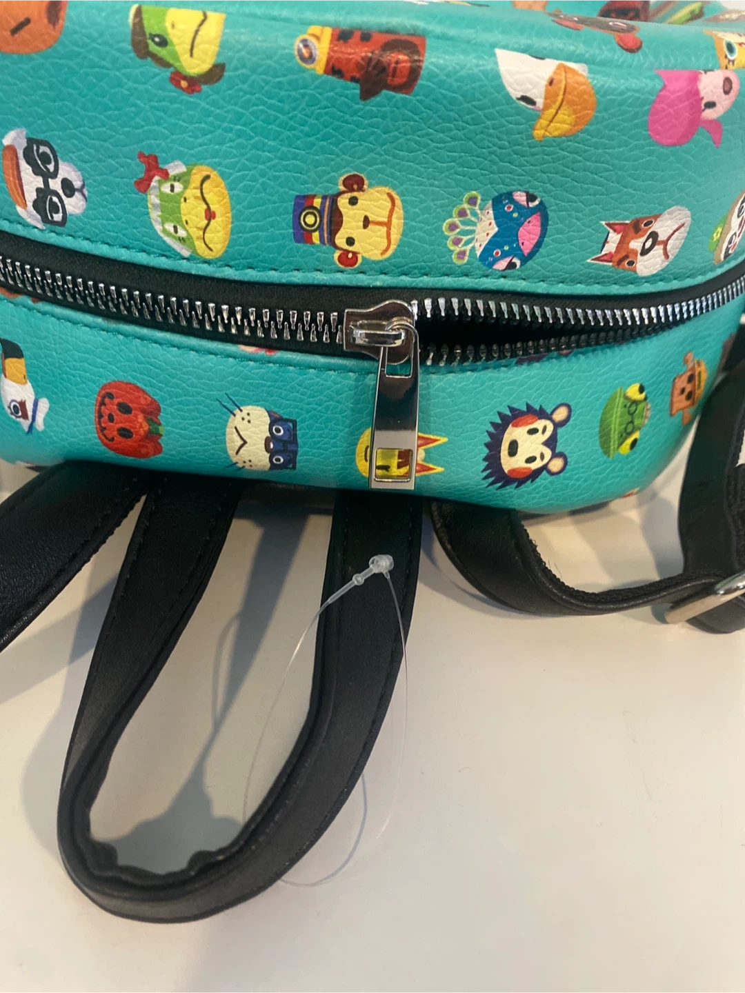 This teal mini backpack features a fun all-over print of Animal Crossing characters. It has a zippered main compartment and a small front pocket. Comes with a leaf charm zipper pull. Perfect for carrying essentials on the go!