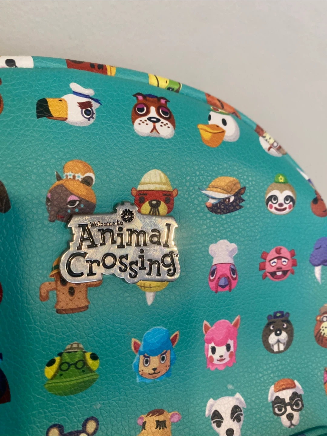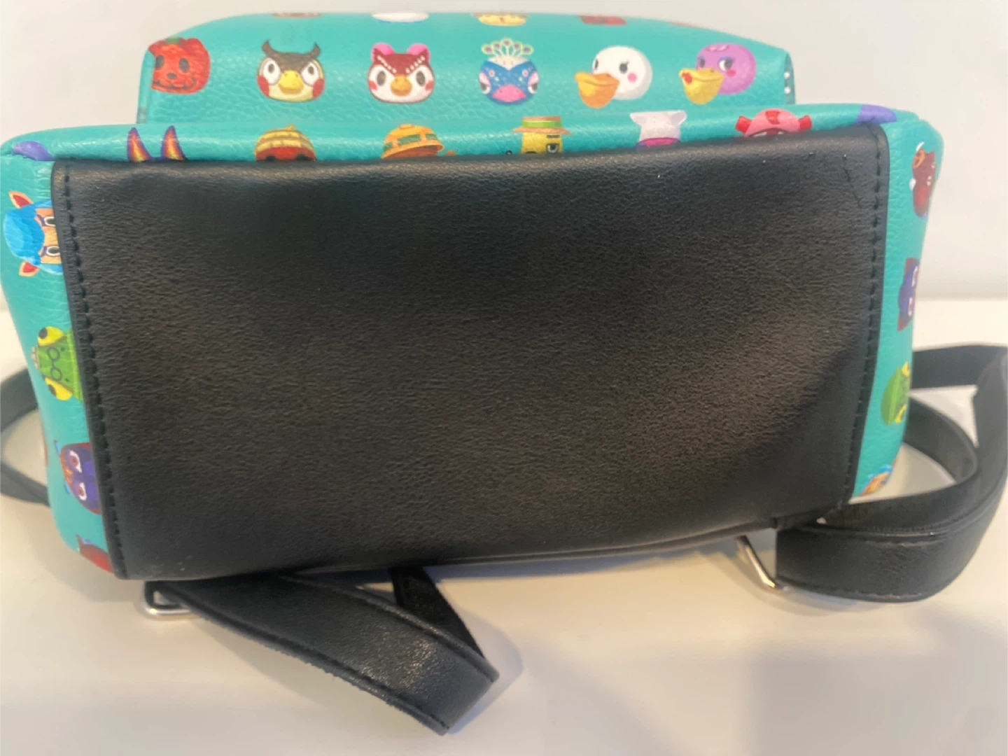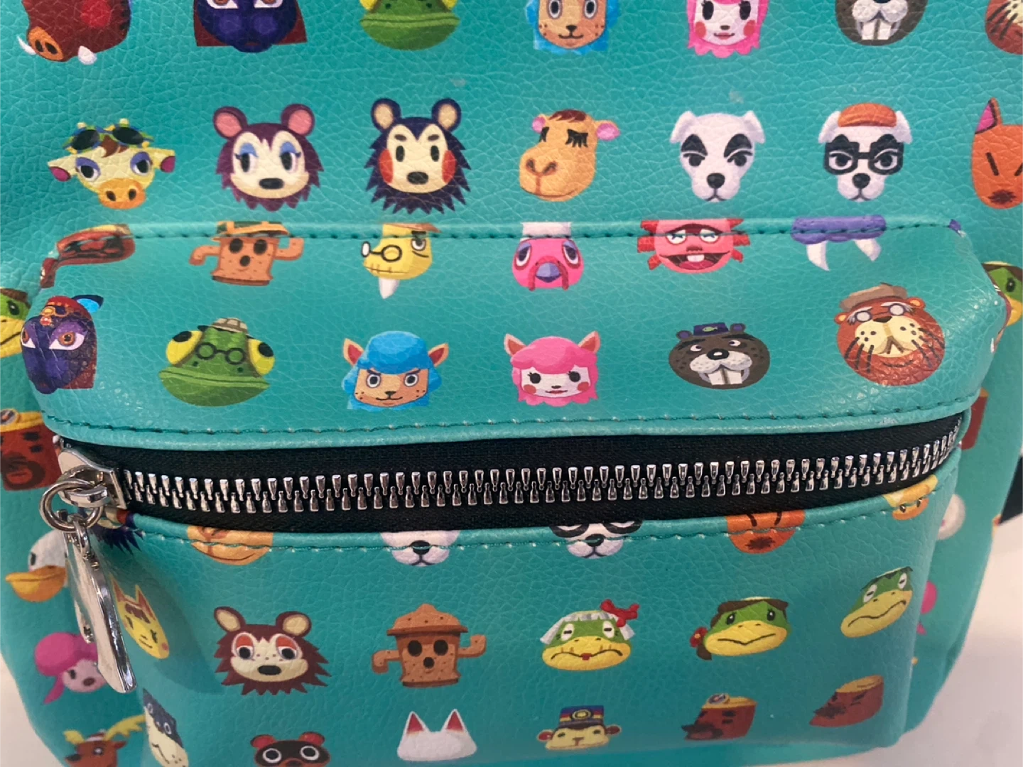 This teal mini backpack features a fun all-over print of Animal Crossing characters. It has a zippered main compartment and a small front pocket. Comes with a leaf charm zipper pull. Perfect for carrying essentials on the go!
