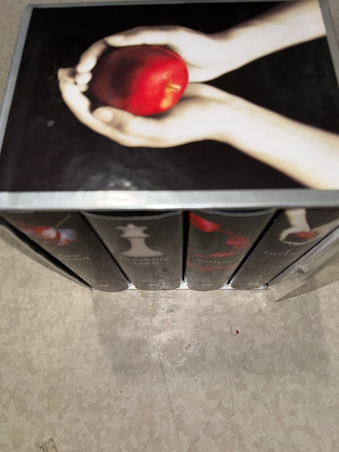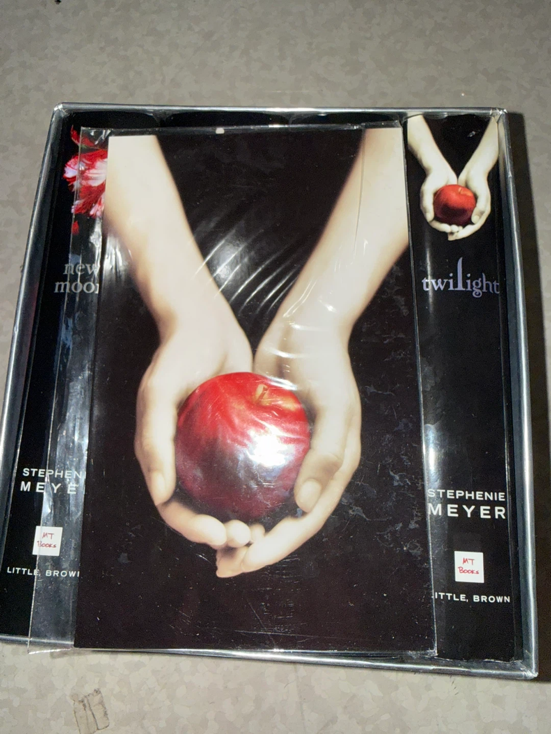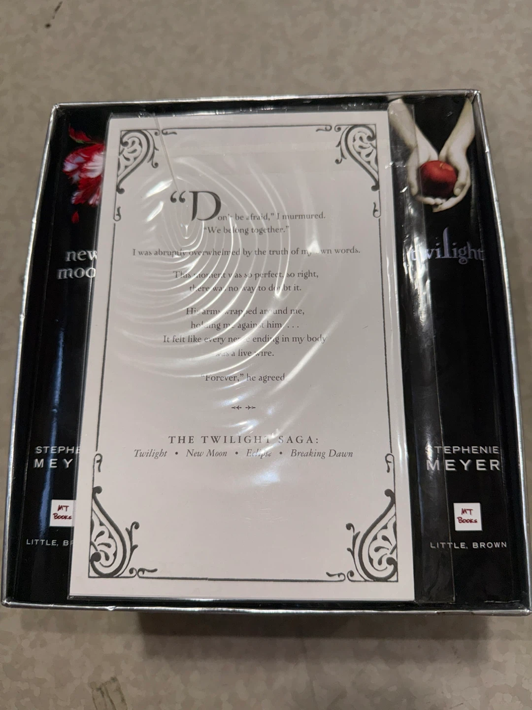 This is a box set of The Twilight Saga books by Stephenie Meyer. It includes Twilight, New Moon, Eclipse, and Breaking Dawn. All books are published by Little, Brown.