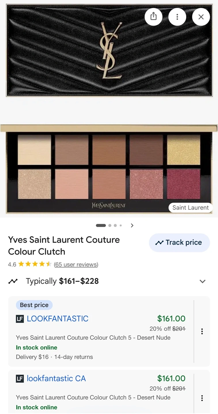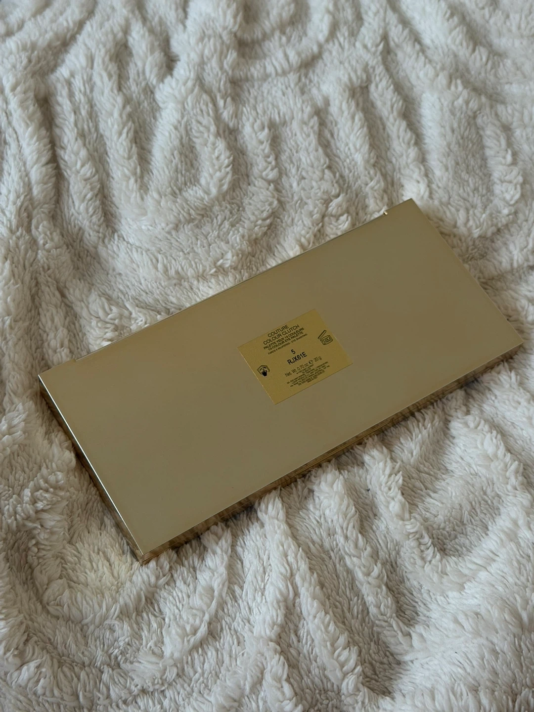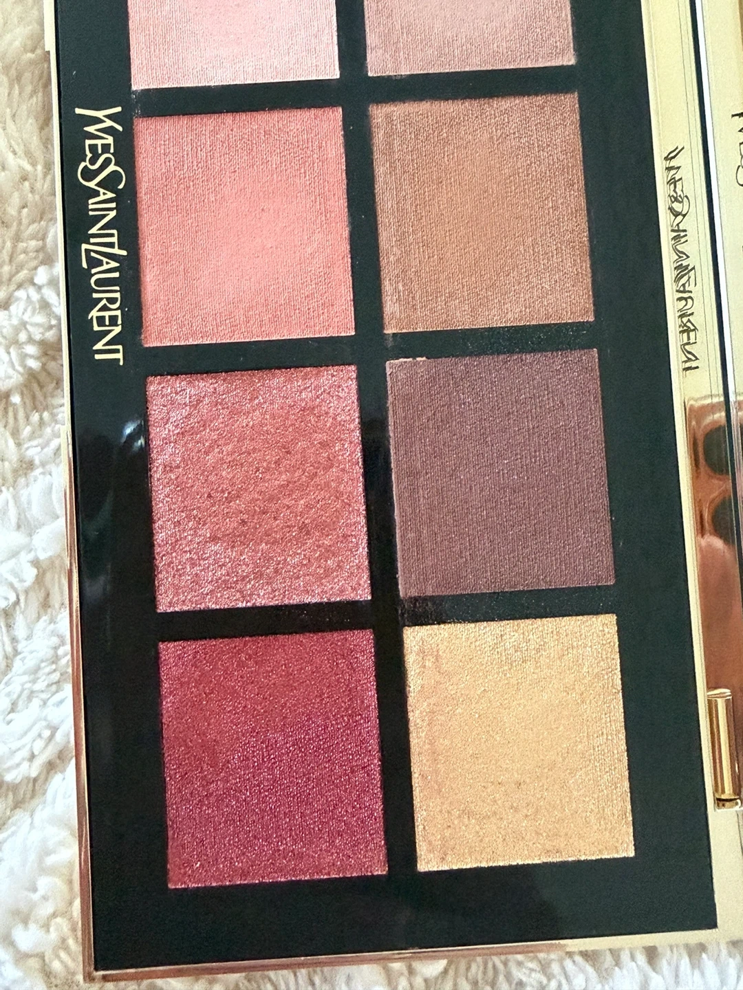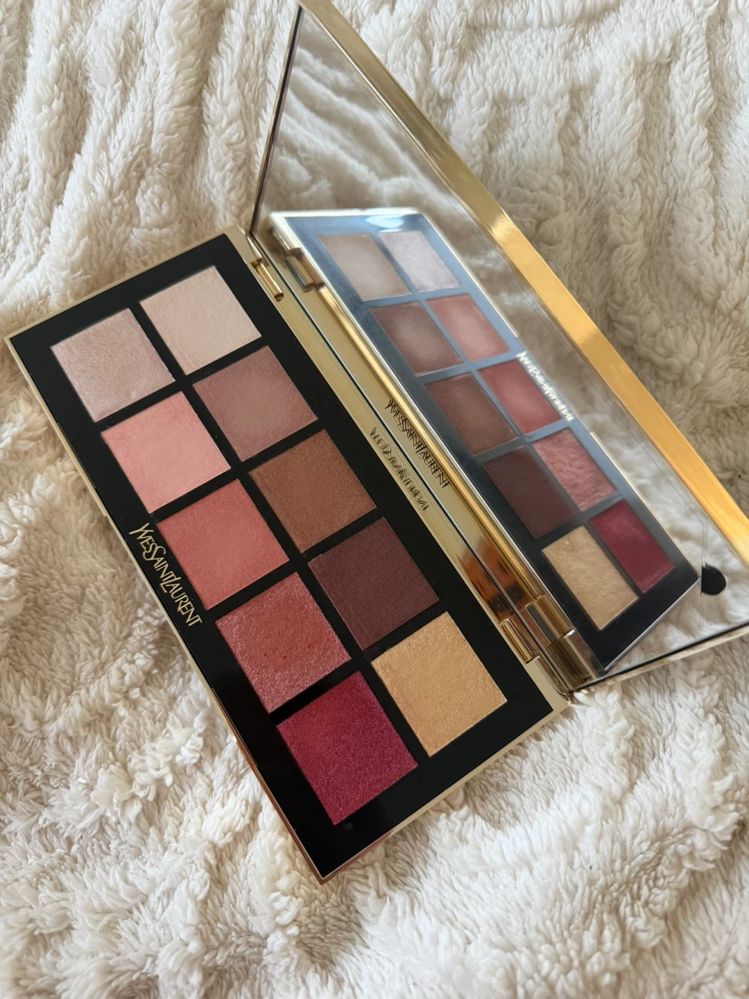 This is an Yves Saint Laurent eyeshadow palette. It features 10 shades with various finishes. The palette is housed in a sleek gold compact.