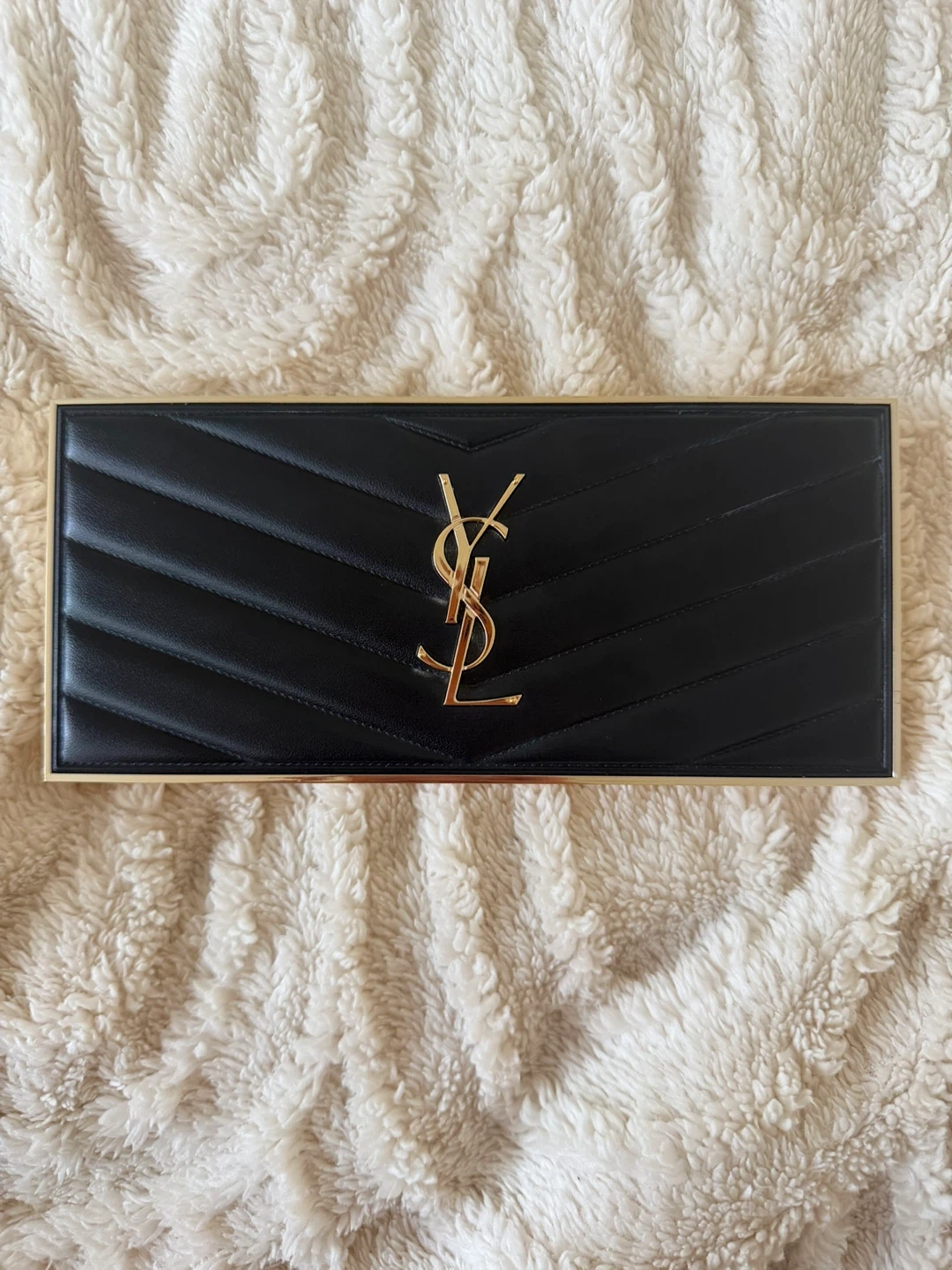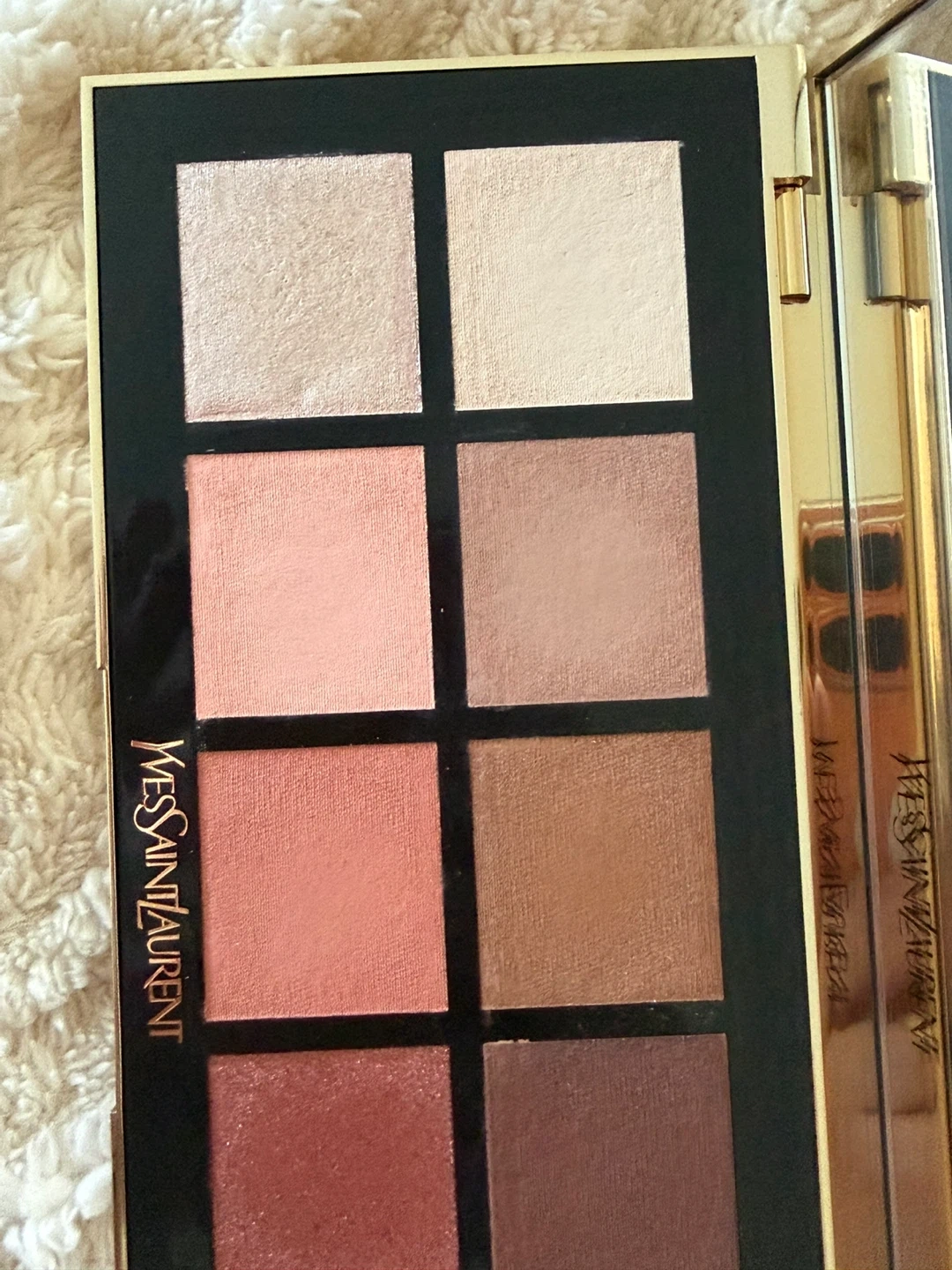 This is an Yves Saint Laurent eyeshadow palette. It features 10 shades with various finishes. The palette is housed in a sleek gold compact.