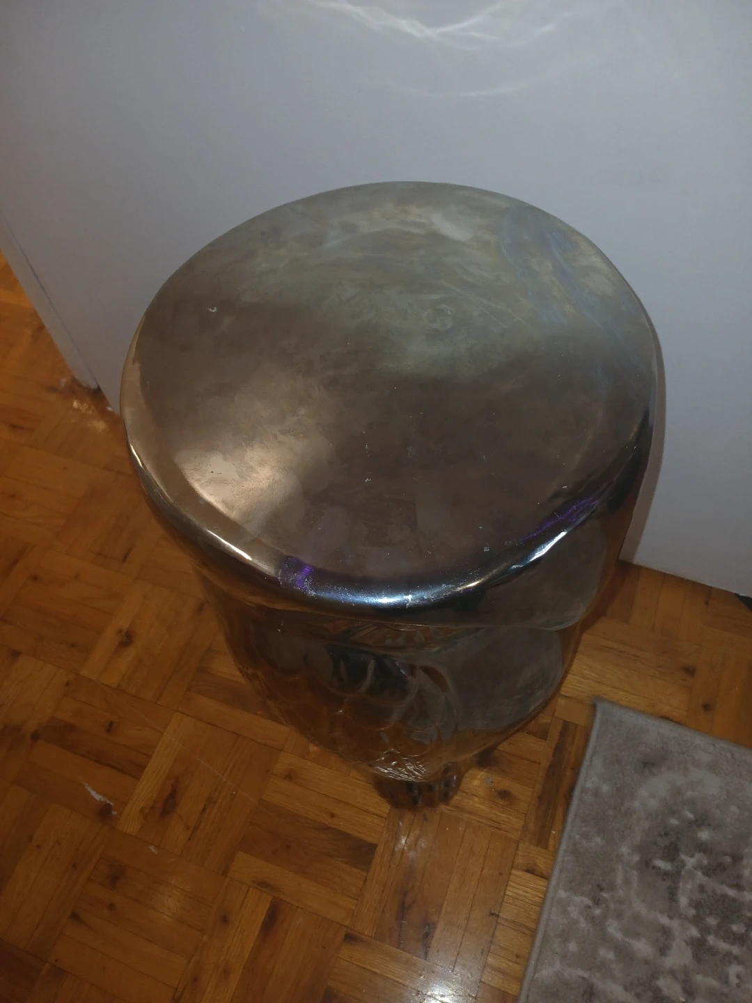 A decorative ceramic owl in a shiny silver finish. It's large enough to be used as a stool or a planter. This piece has a unique, eye-catching design.
