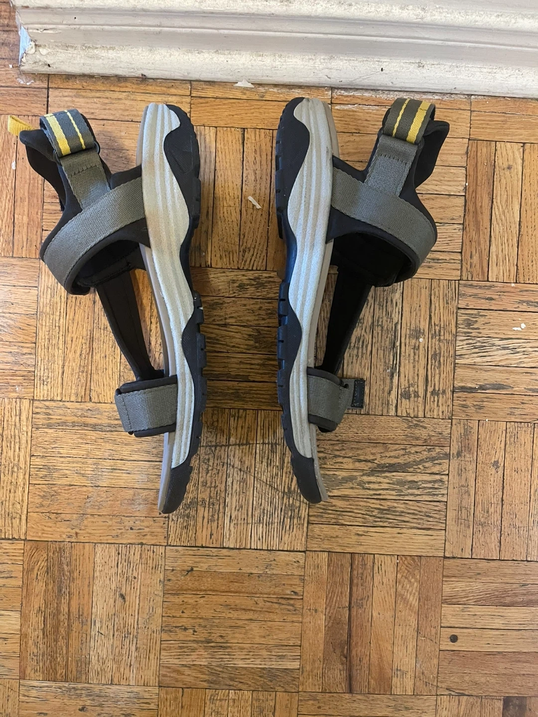 These are men's athletic sandals with adjustable straps. They have a durable rubber sole and a cushioned footbed. Great for hiking or casual wear in the summer!