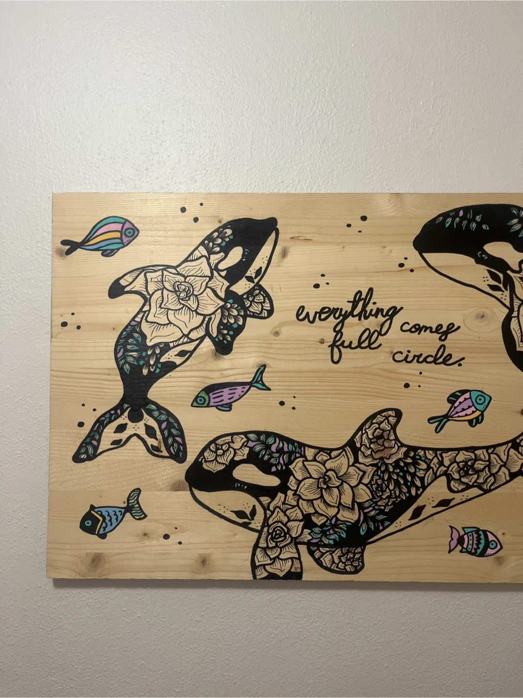 This wooden wall art features a beautiful illustration of orcas and fish, with the text "everything comes full circle". It's a unique piece of decor. The artwork is signed "JUNE 2021".