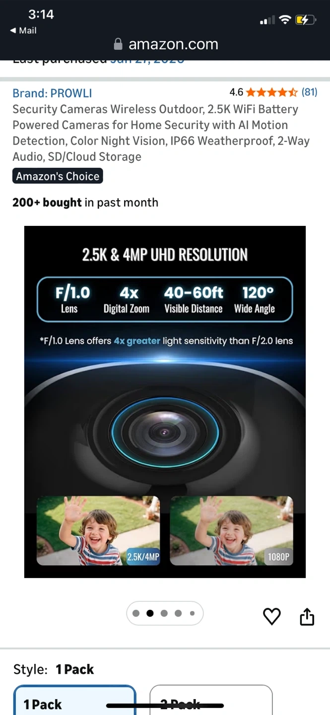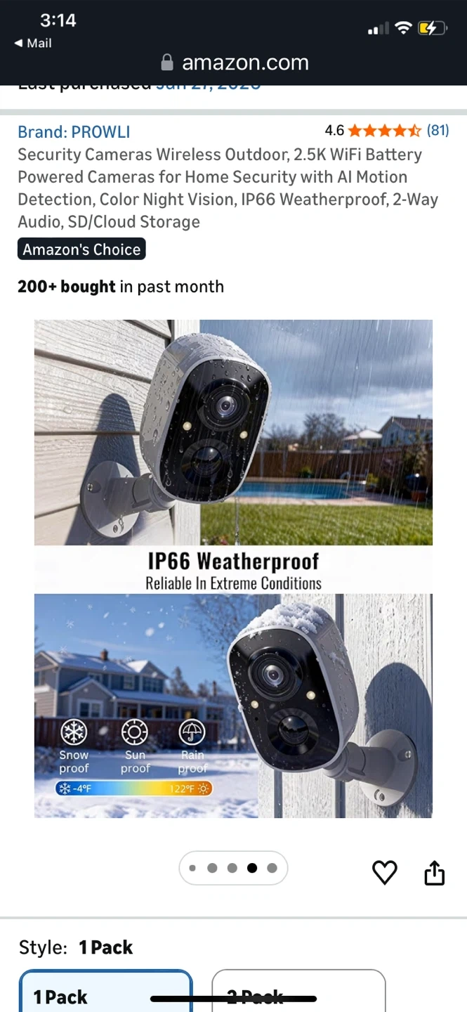 This PROWLI wireless security camera offers 2.5K UHD resolution with full color night vision. It's IP66 weatherproof and features AI motion detection, 2-way audio, and up to 6 months of battery life. SD/Cloud storage is supported.