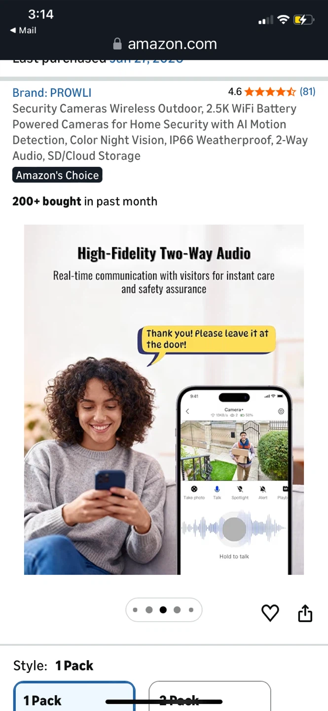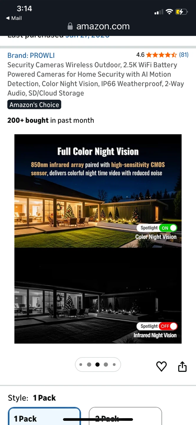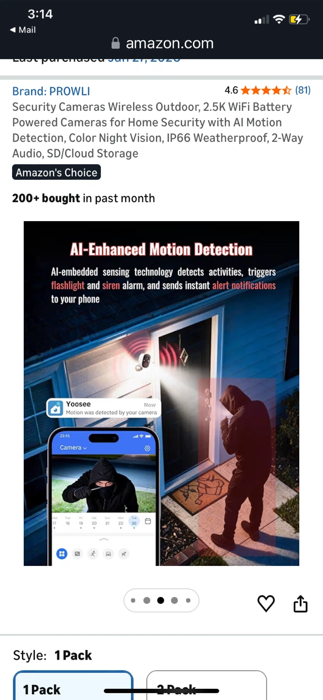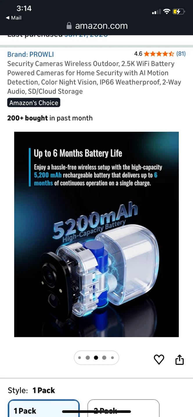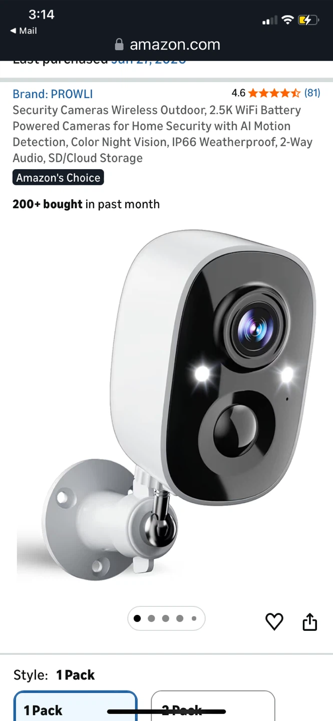 This PROWLI wireless security camera offers 2.5K UHD resolution with full color night vision. It's IP66 weatherproof and features AI motion detection, 2-way audio, and up to 6 months of battery life. SD/Cloud storage is supported.