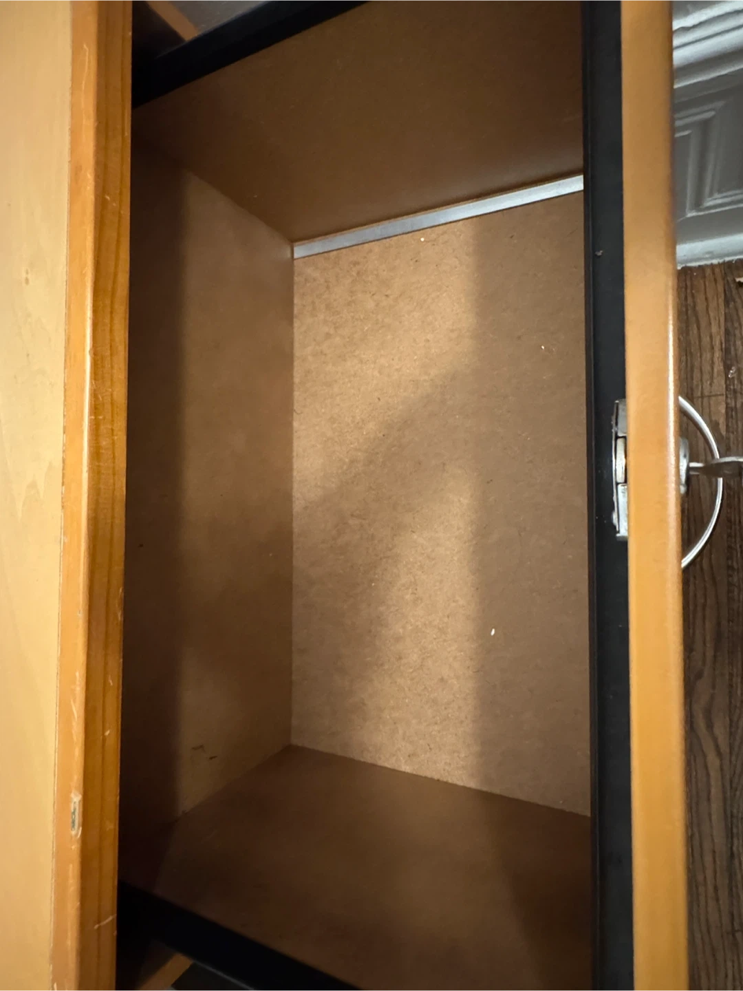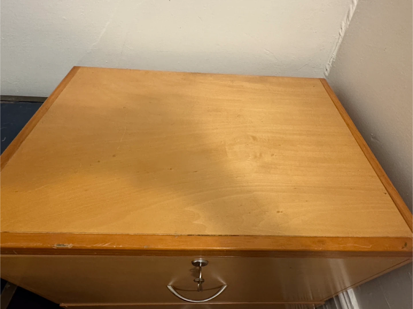 A two-drawer filing cabinet made of wood-tone material. It comes with a key for locking the top drawer. Bottom drawer doesn’t lock. Great for organizing documents at home or in an office!