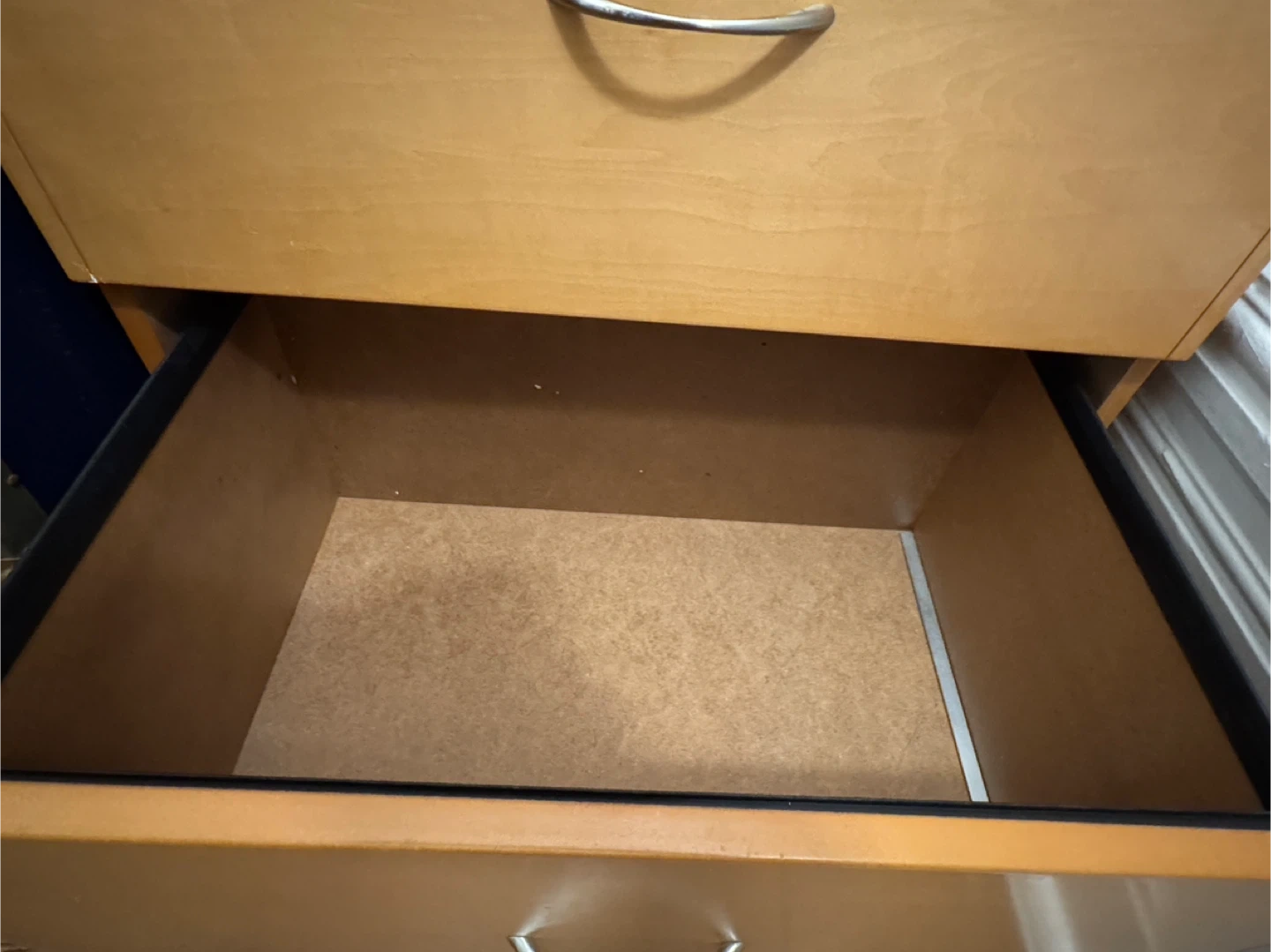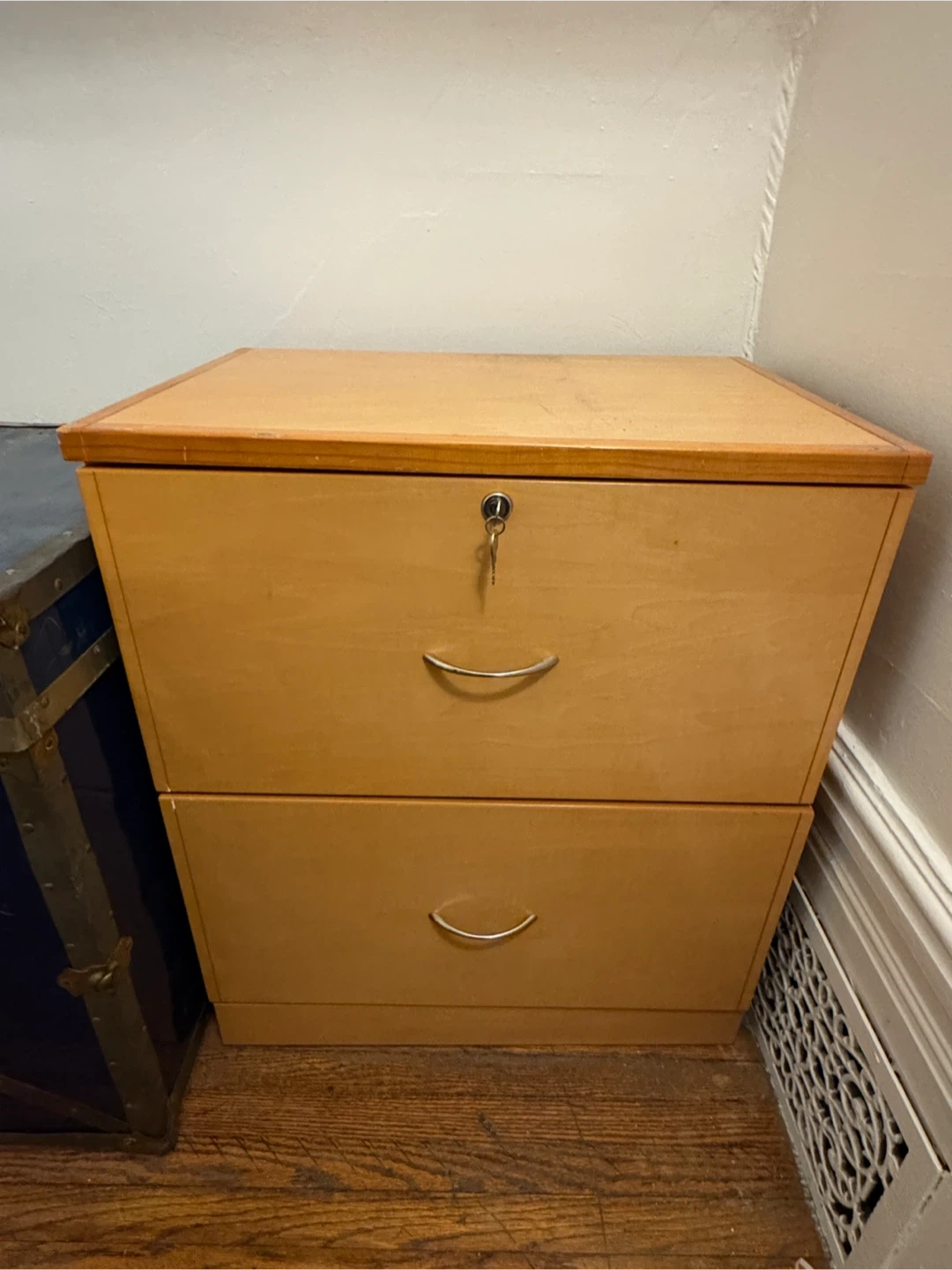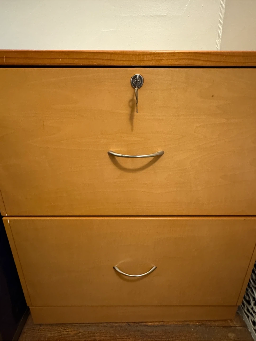 A two-drawer filing cabinet made of wood-tone material. It comes with a key for locking the top drawer. Bottom drawer doesn’t lock. Great for organizing documents at home or in an office!